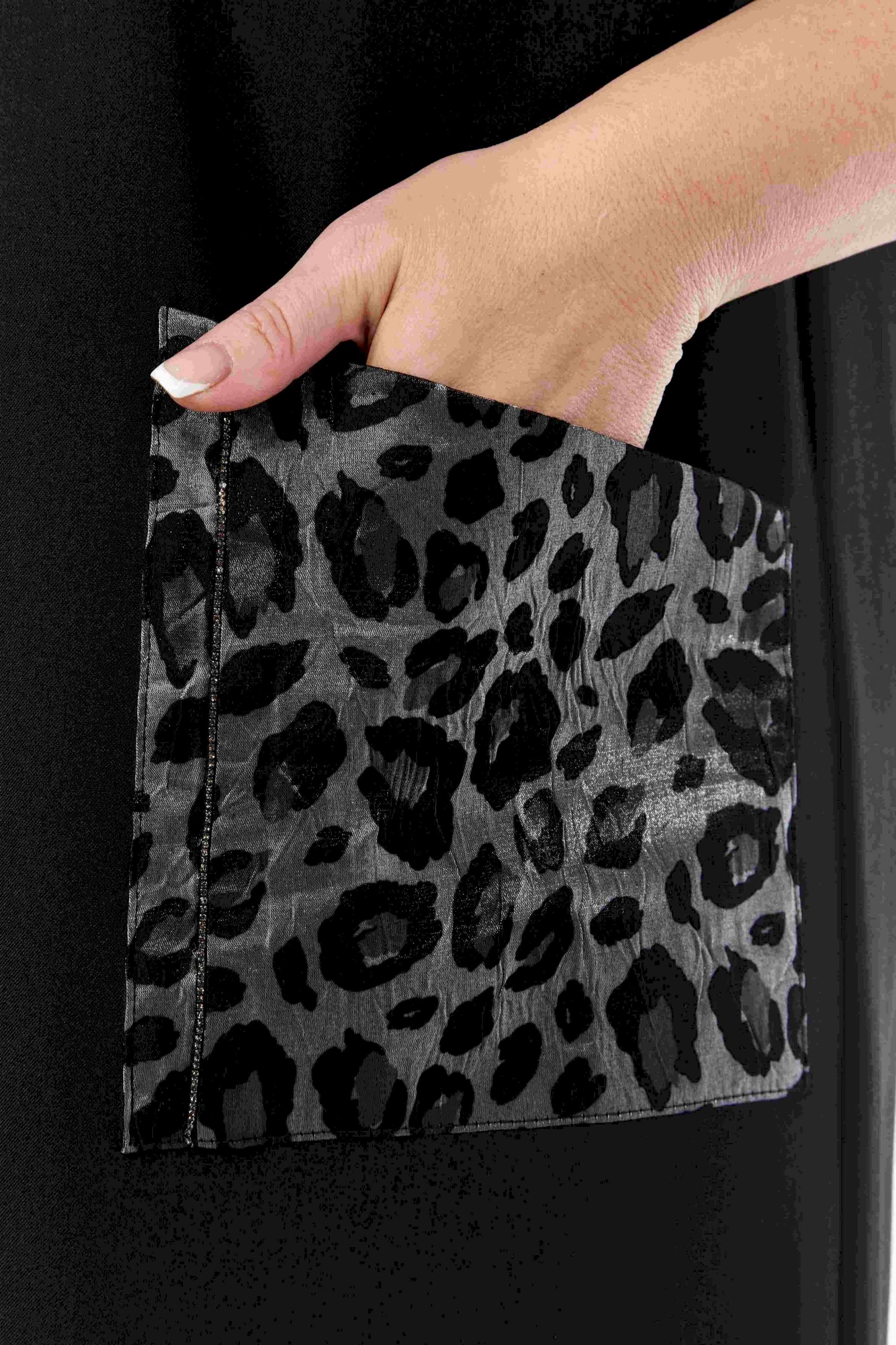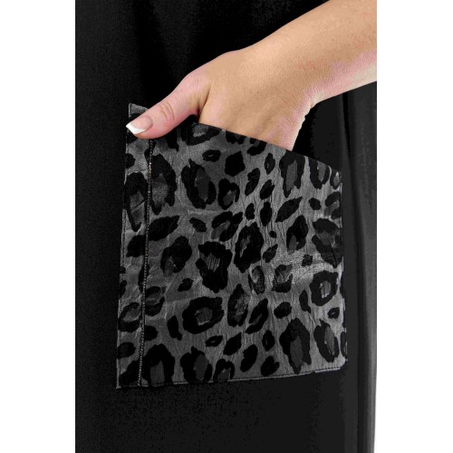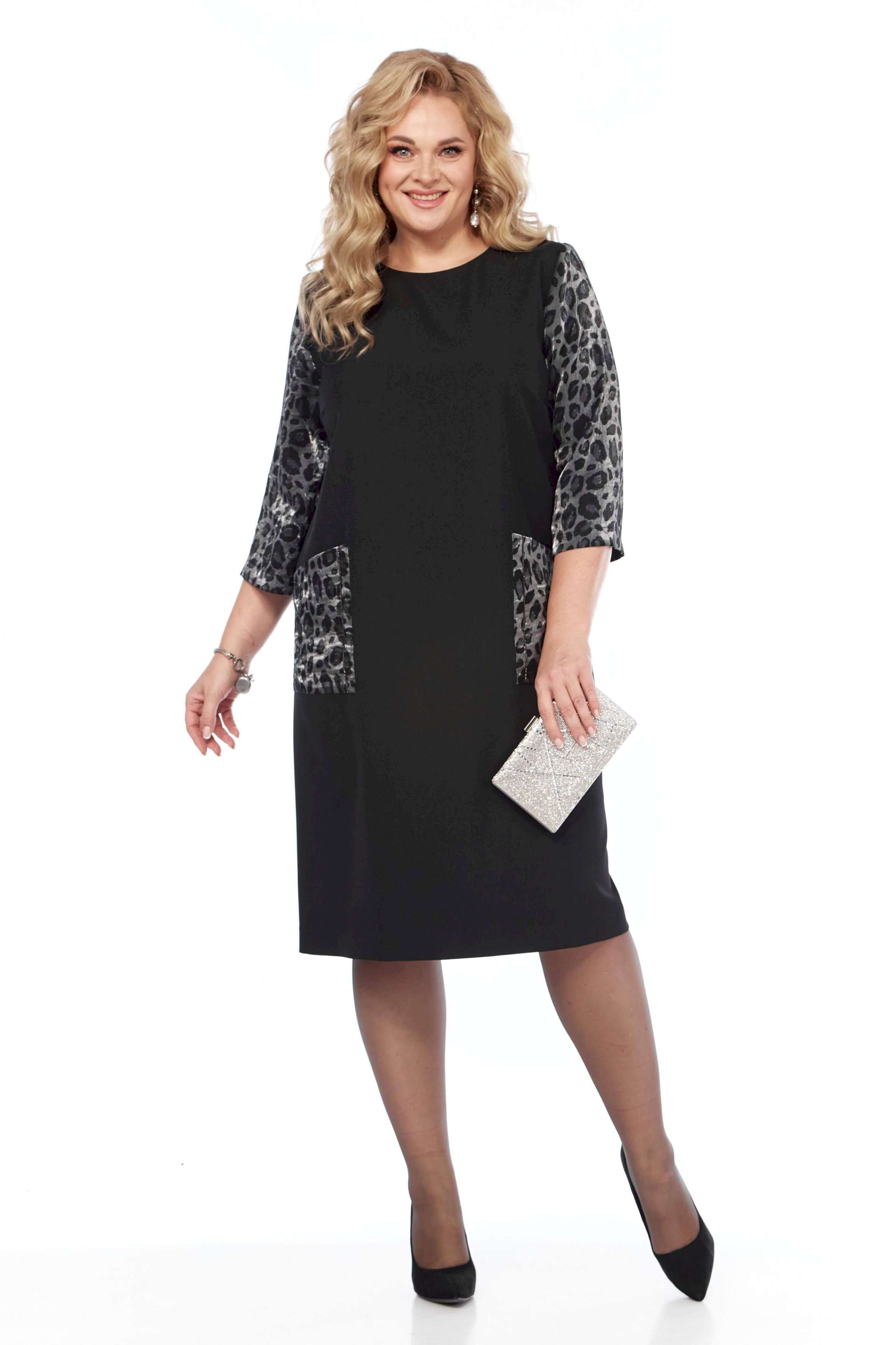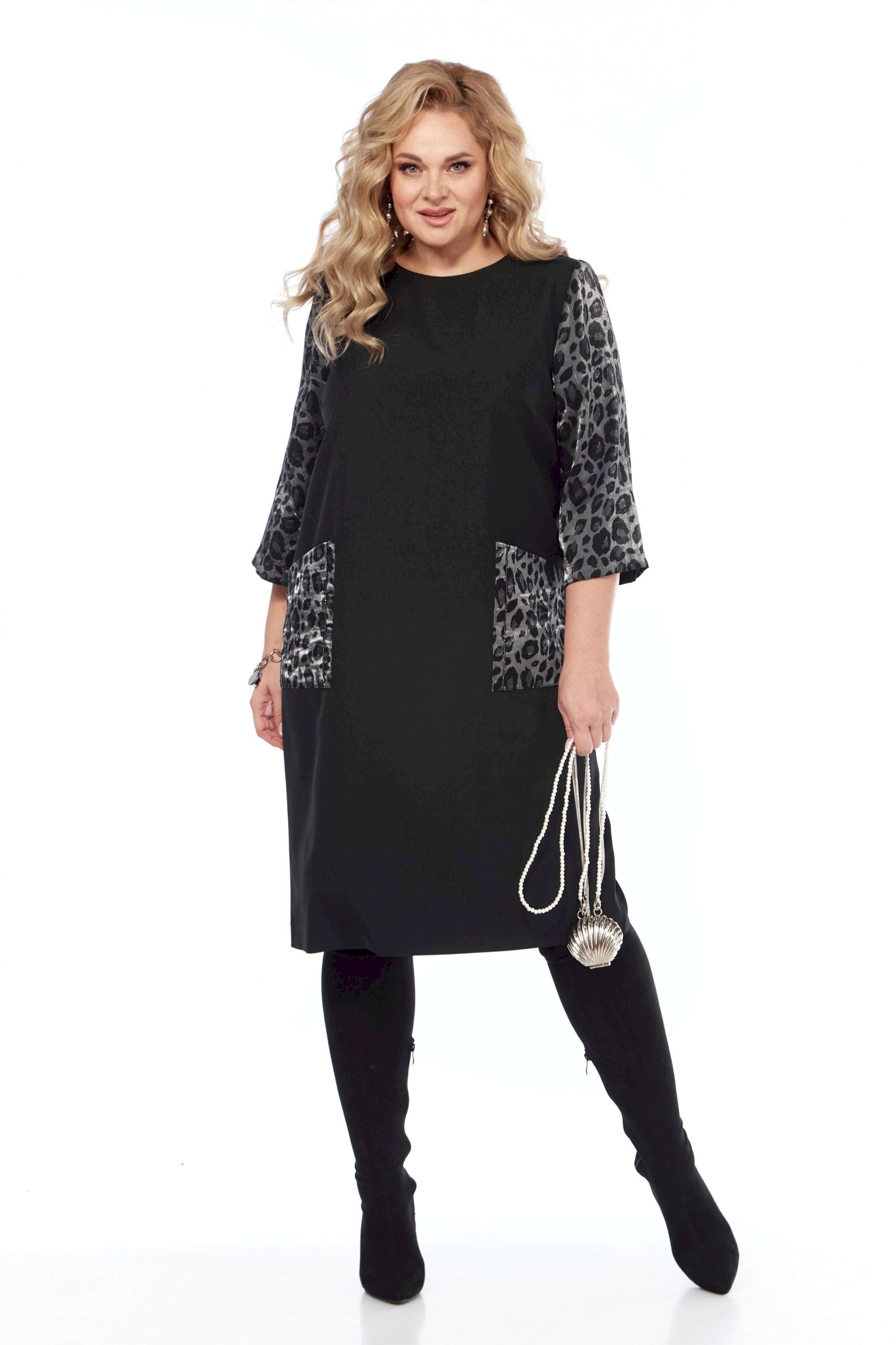 Платье женское прямого силуэта, скомбинированное из двух видов ткани. Перед с нагрудными вытачками, выходящими из боковых швов и фигурными накладными карманами с отделочным кантом. Спинка цельная с молнией, по горловине с отделкой. Рукав втачной, одношовный, прямой, длиной 3/4. Горловина овальной формы. Длина платья по спинке - 102 см. Длина рукава - 46 см.