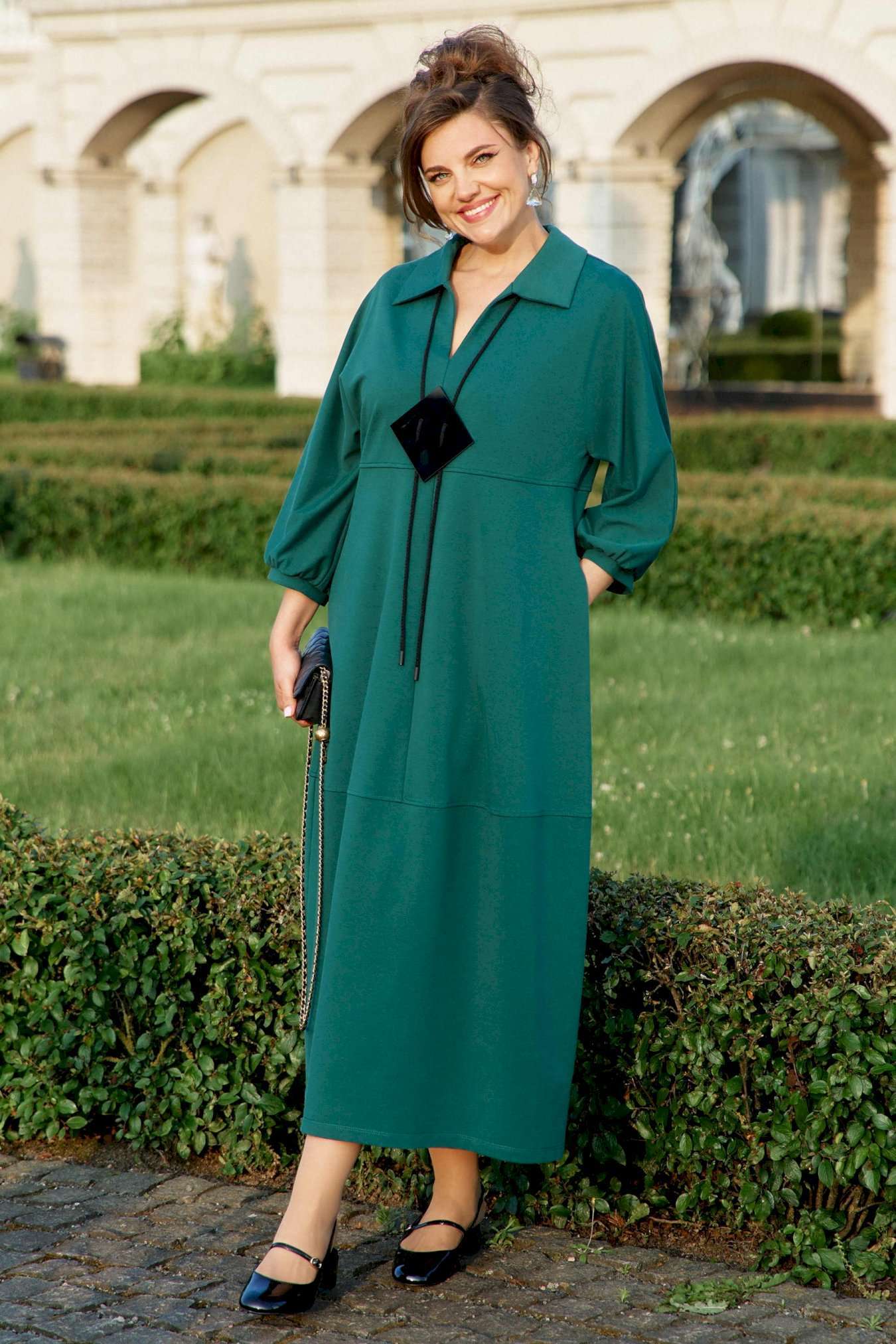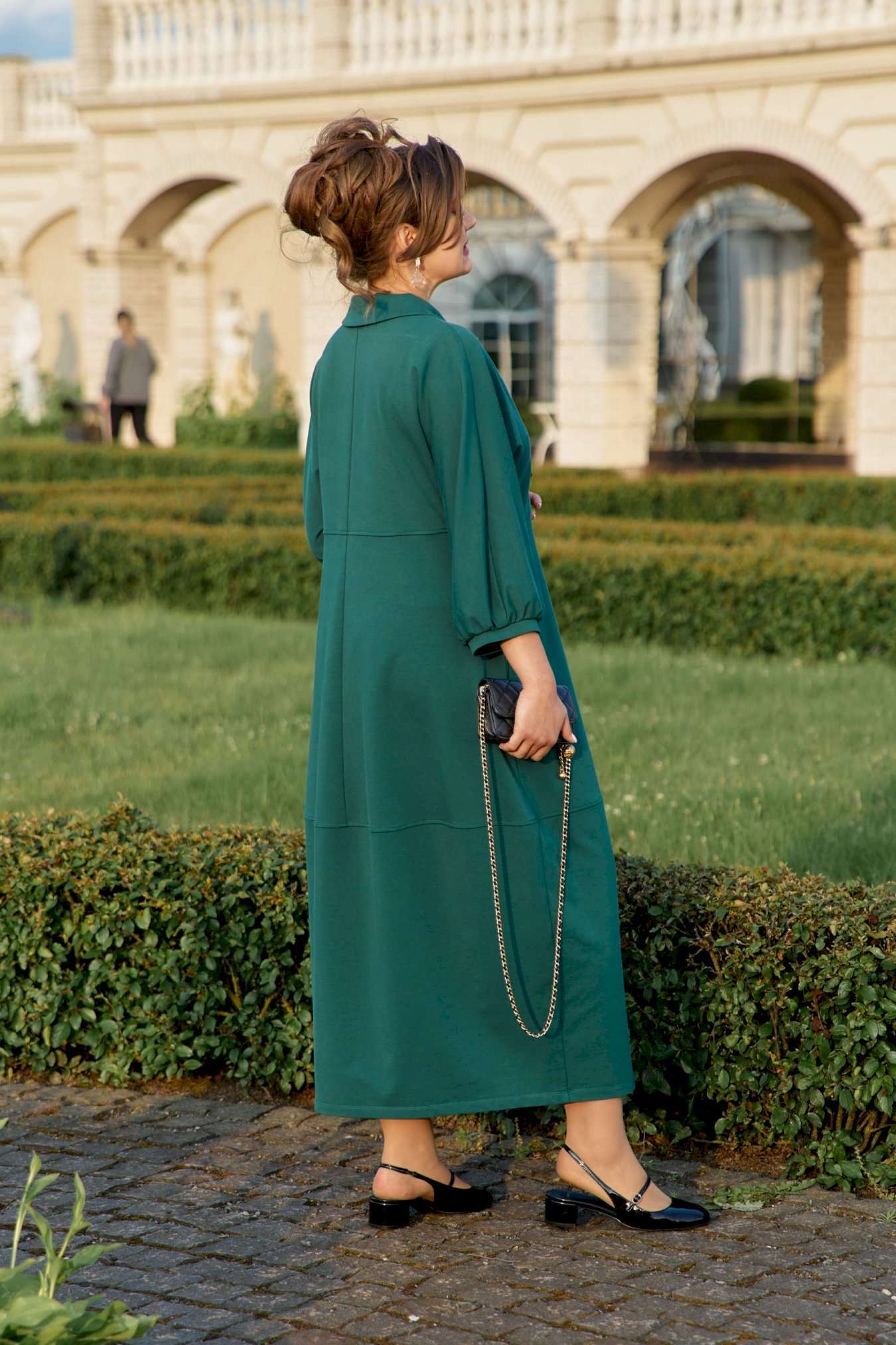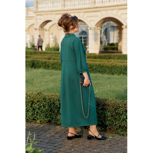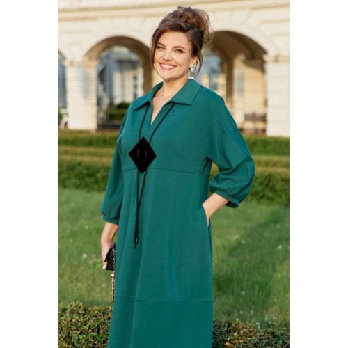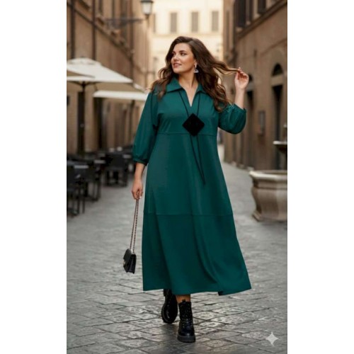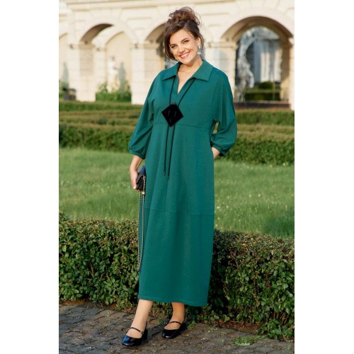 Представляем вашему вниманию элегантное платье миди в насыщенном чёрном оттенке, который актуален в любом сезоне. Выполненное из мягкой, струящейся ткани, оно обеспечивает приятные ощущения при носке и безупречную посадку. Свободный крой платья напоминающий собой форму «купола» слегка заужается к низу придает силуэту изящество и позволяет ему деликатно ниспадать по фигуре. V-образный вырез горловины, дополненный отложным воротником, придает платью классический и в то же время современный вид. Линия талии завышенная, лиф платья двойной, со средним швом. Рукав в платье цельнокроеный со сборкой на манжету, добавляют образу непринужденности и объема. Горизонтальный шов, расположенный примерно на уровне бедер, создает интересный структурный акцент. В боковых швах карманы. В качестве дополнительного декоративного элемента в комплекте с платьем идёт украшение ручной работы. Длина платья 125 см., длина рукава 62,5 см (р 52-56), 64,5 см (р 58-62).
