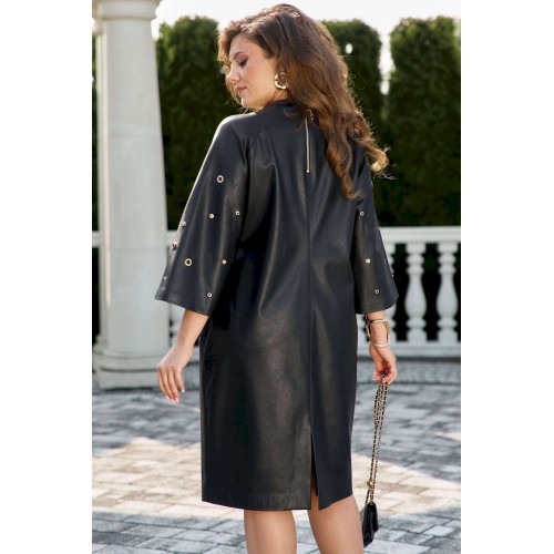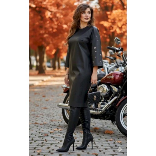 Платье полуприлегающего силуэта с округлой формой горловины. По переду платья нагрудные вытачки. По спинке застёжка на декоративную тесьму молнию в среднем шве платья и разрезом от низа. Рукава становятся главным акцентом: ряд люверсов и кнопок, выстроенных словно доспехи, придают образу дерзкий, почти урбанистический шик. Рукав в платье реглан, расширяется к низу, длиной 7/8. В боковых швах платье карманы. Длина платья 109 см (р 50-54), 111 см (р 56-60). Длина рукава 61 см.