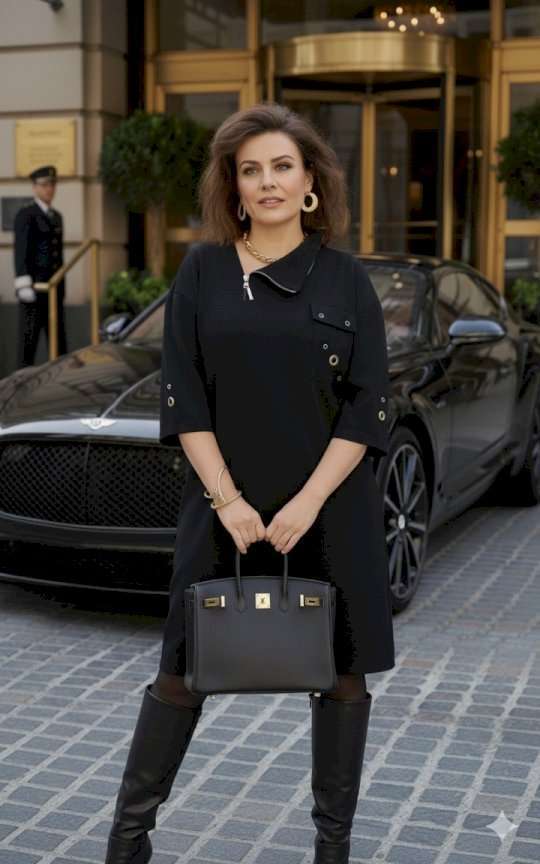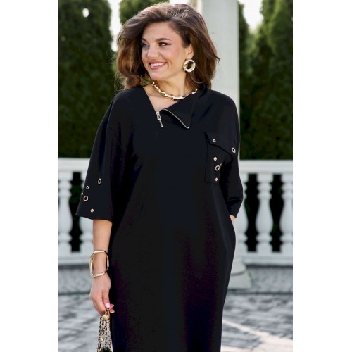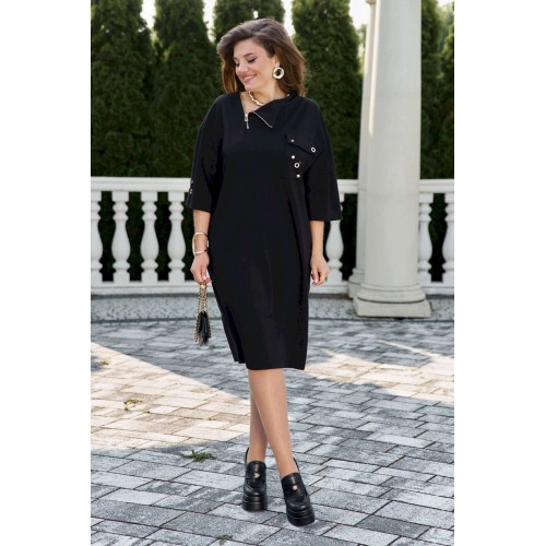 Платье свободного силуэта, горловина ассиметричной формы. По переду платья фигурная кокетка с функциональной молнией, нагрудный карман с клапаном и декоративной отделкой в виде металлической фурнитуры. Линия плеча спущенная, рукав втачной, длиной ¾, широкий к низу. Спинка в платье со средним швом заканчивающимся разрезом. В боковых швах платья карманы. Длина платья 106 см (р 50-54), 108 см (р 56-60). Длина рукава 30,5 см.