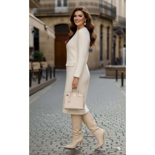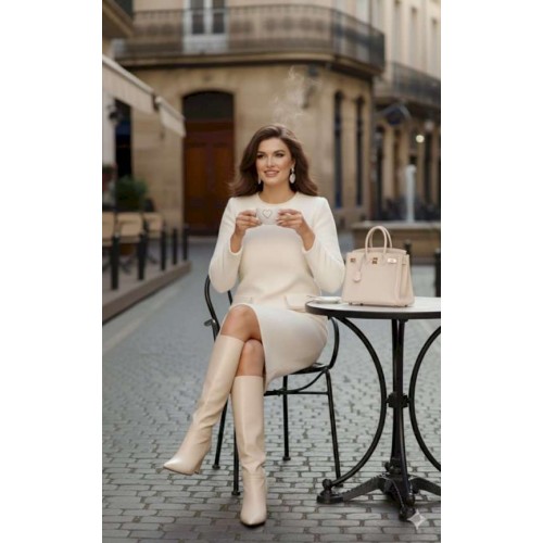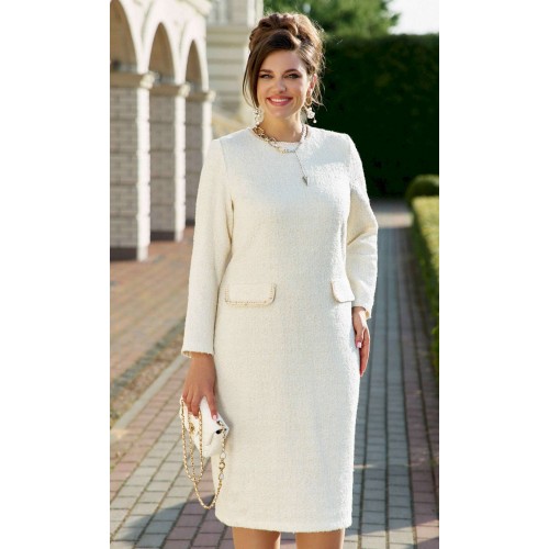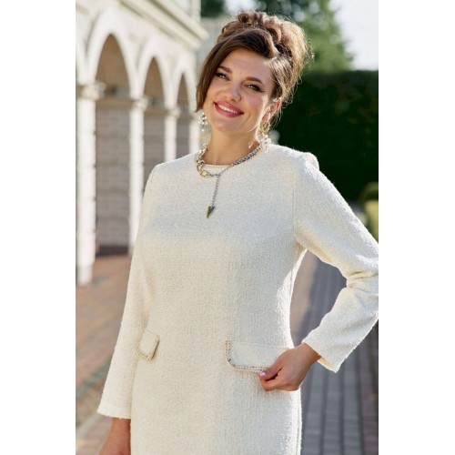 Безумно красивое и элегантное платье в модном оттенке «сливочного масла» мягко обволакивает фигуру, создавая тем самым шикарный образ. Его стиль, утончённость делает женщину поистине роскошной. Платье идеально подойдёт как для повседневной носки, так и для торжественных выходов, подчеркивает достоинства фигуры и успешно скрывает все недостатки. Платье прилегающего силуэта с округлой горловиной с отделкой в виде декоративной отделочной тесьмы. По переду платья нагрудные вытачки, отделочные клапана карманов с декоративной отделкой в виде тесьмы. По спинке застёжка на декоративную тесьму-молнию. Рукав в платье втачной, длинный. Платье на подкладке. Длина платья 111 см (р 48-52), 111,5 см (р 54-58), длина рукава 61 см.