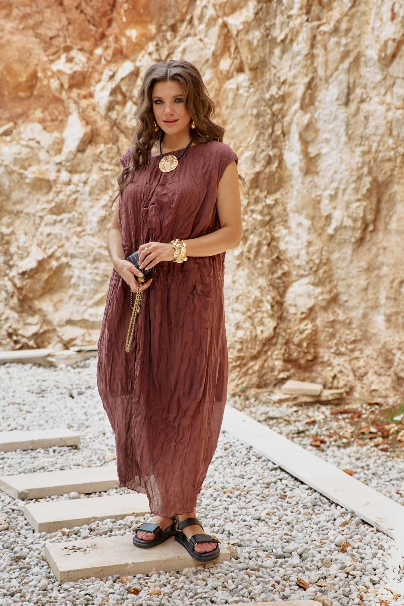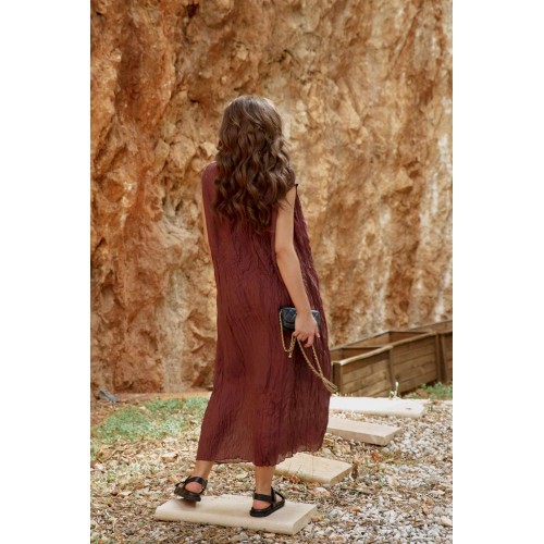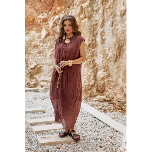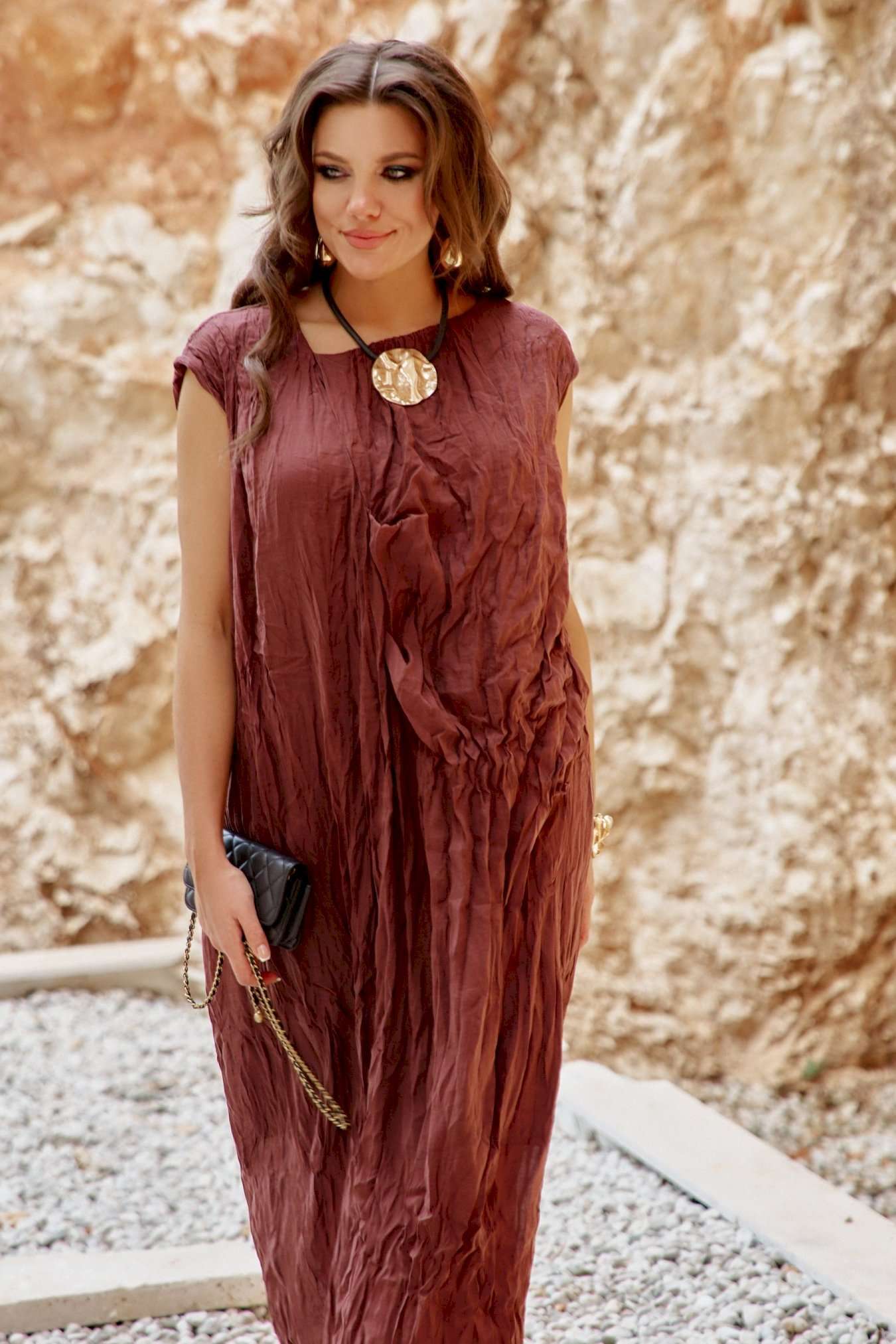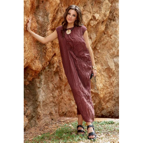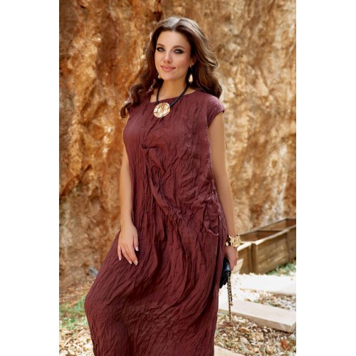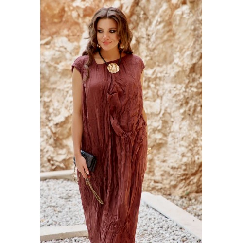 Женское платье в изысканном шоколадном оттенке, является настоящим произведением искусства, создавая гармоничное сочетание, которое привлекает внимание и восхищает. Дополняя это платье аксессуарами, которые подчеркнут общий образ— Вы будете выглядеть изящно, чувствовать себя увереннее и привлекательнее в любой обстановке: будь то романтический вечер, встреча с подругами или прогулка по городу. Дополнительную фактуру платью придаёт мятый эффект. Мятый эффект это не небрежность, а тщательно продуманный художественный прием. Она добавляет тактильности — хочется прикоснуться, ощутить эту "живую" текстуру, смягчает силуэт — делает образ менее формальным, более человечным. Платье свободного силуэта, с фигурным вырезом горловины. По переду платья подрез, от которого закладываются декоративные складки. Линия плеча в платье спущенная. Спинка со средним швом. Платье на подкладке. Платье не обтягивает, следует естественным линиям тела, создавая ощущение легкости и свободы. Длина платья 132 см.