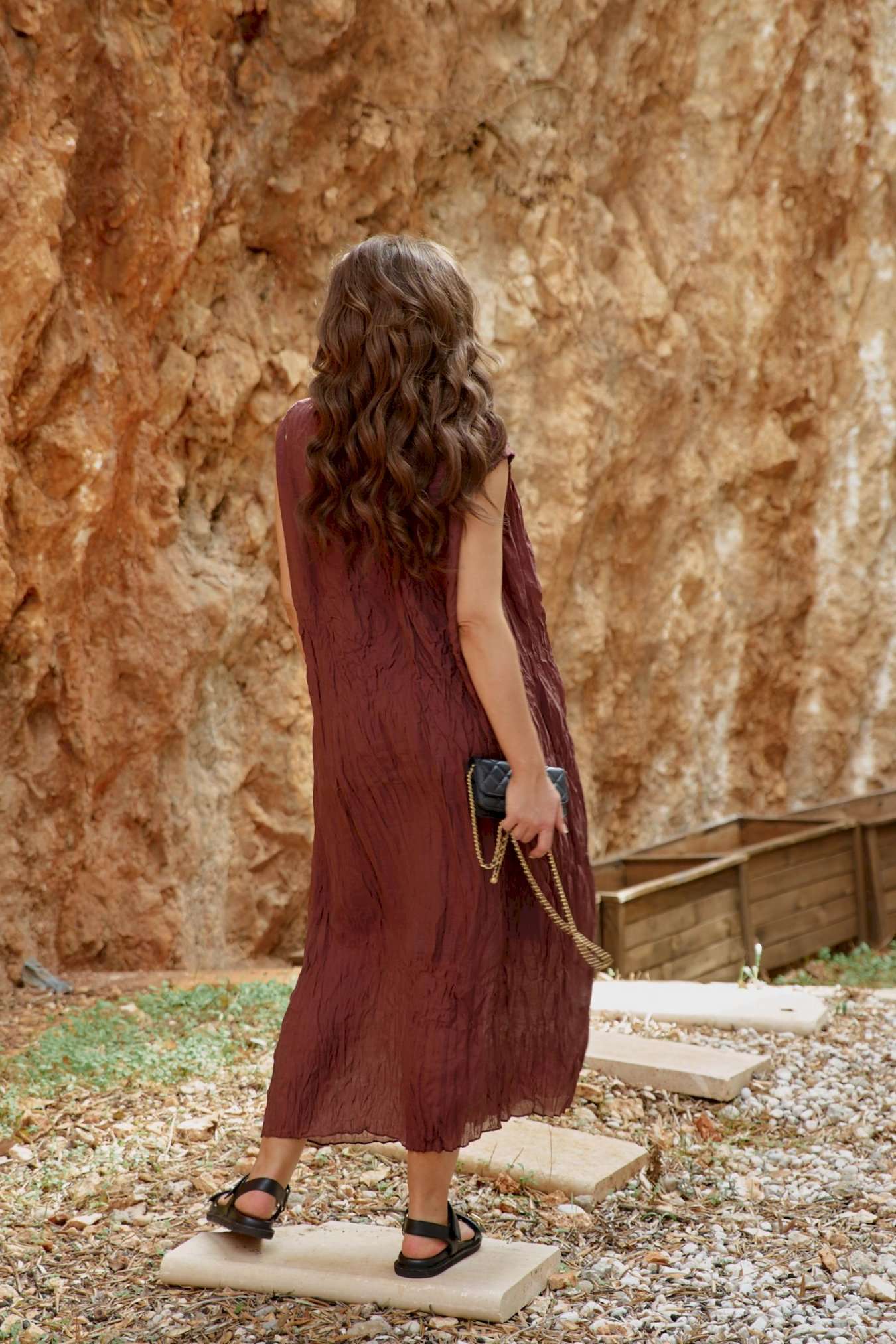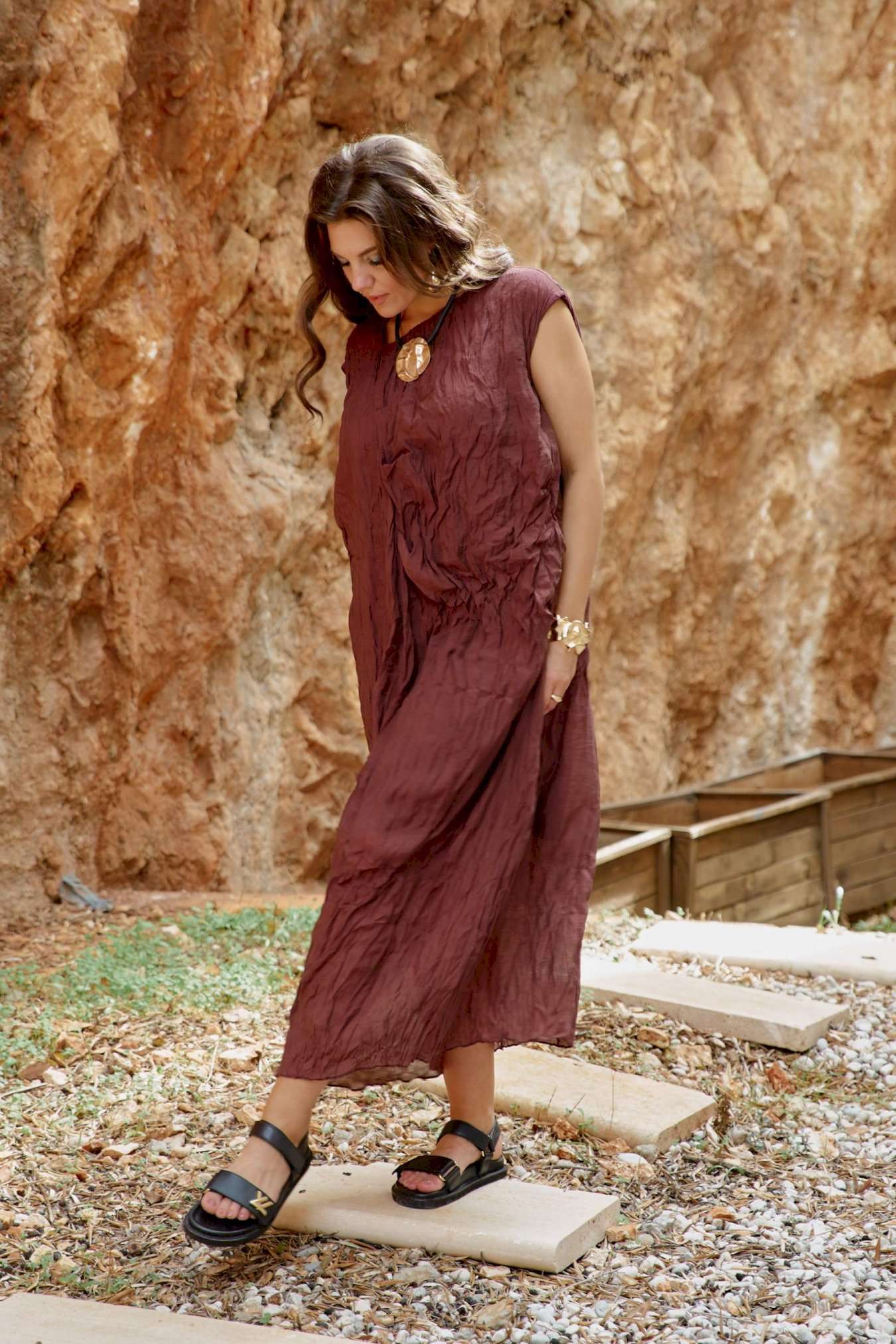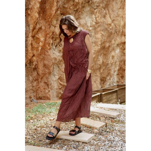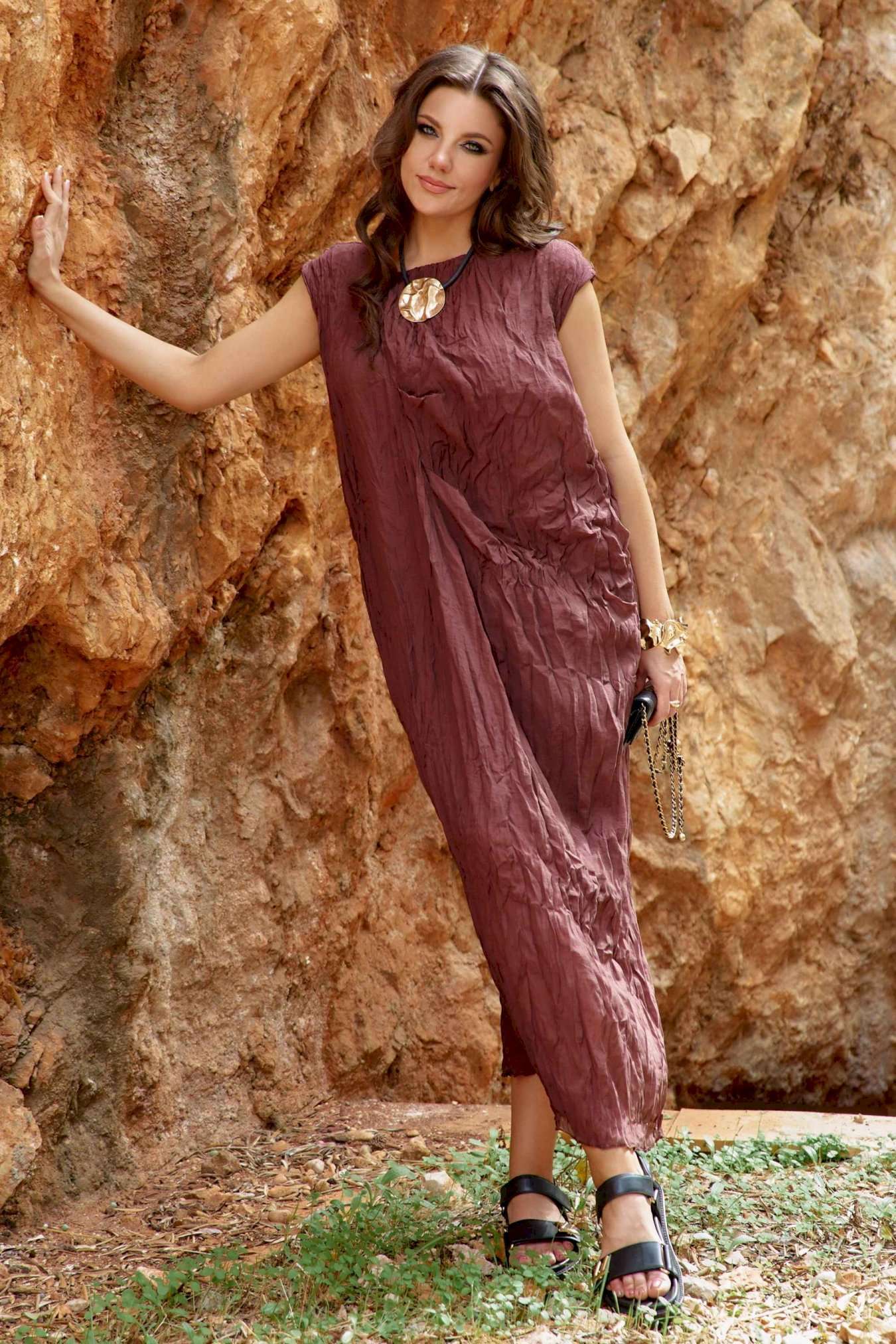 Женское платье в изысканном шоколадном оттенке, является настоящим произведением искусства, создавая гармоничное сочетание, которое привлекает внимание и восхищает. Дополняя это платье аксессуарами, которые подчеркнут общий образ— Вы будете выглядеть изящно, чувствовать себя увереннее и привлекательнее в любой обстановке: будь то романтический вечер, встреча с подругами или прогулка по городу. Дополнительную фактуру платью придаёт мятый эффект. Мятый эффект это не небрежность, а тщательно продуманный художественный прием. Она добавляет тактильности — хочется прикоснуться, ощутить эту "живую" текстуру, смягчает силуэт — делает образ менее формальным, более человечным. Платье свободного силуэта, с фигурным вырезом горловины. По переду платья подрез, от которого закладываются декоративные складки. Линия плеча в платье спущенная. Спинка со средним швом. Платье на подкладке. Платье не обтягивает, следует естественным линиям тела, создавая ощущение легкости и свободы. Длина платья 132 см.