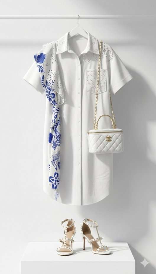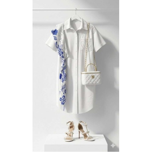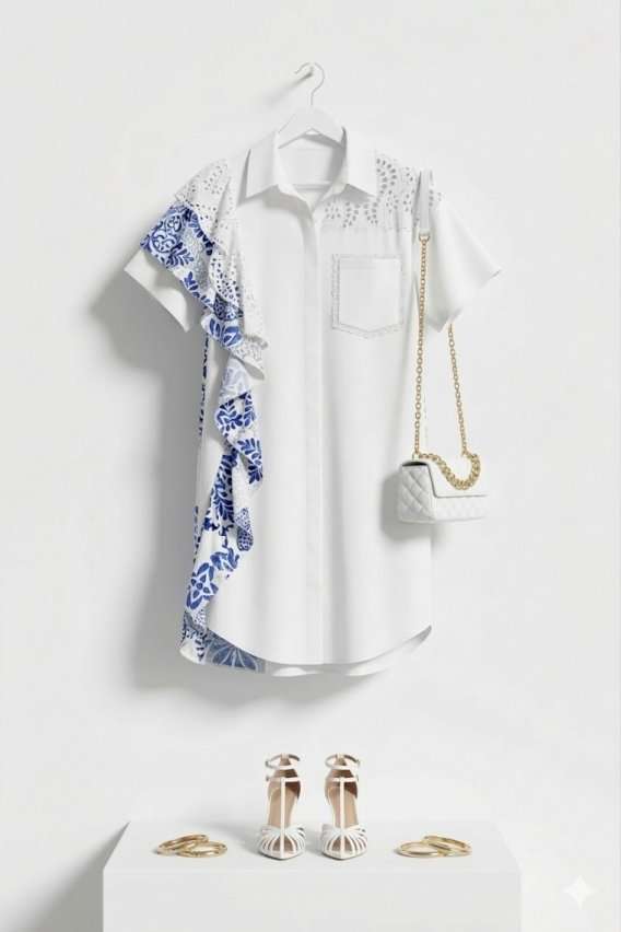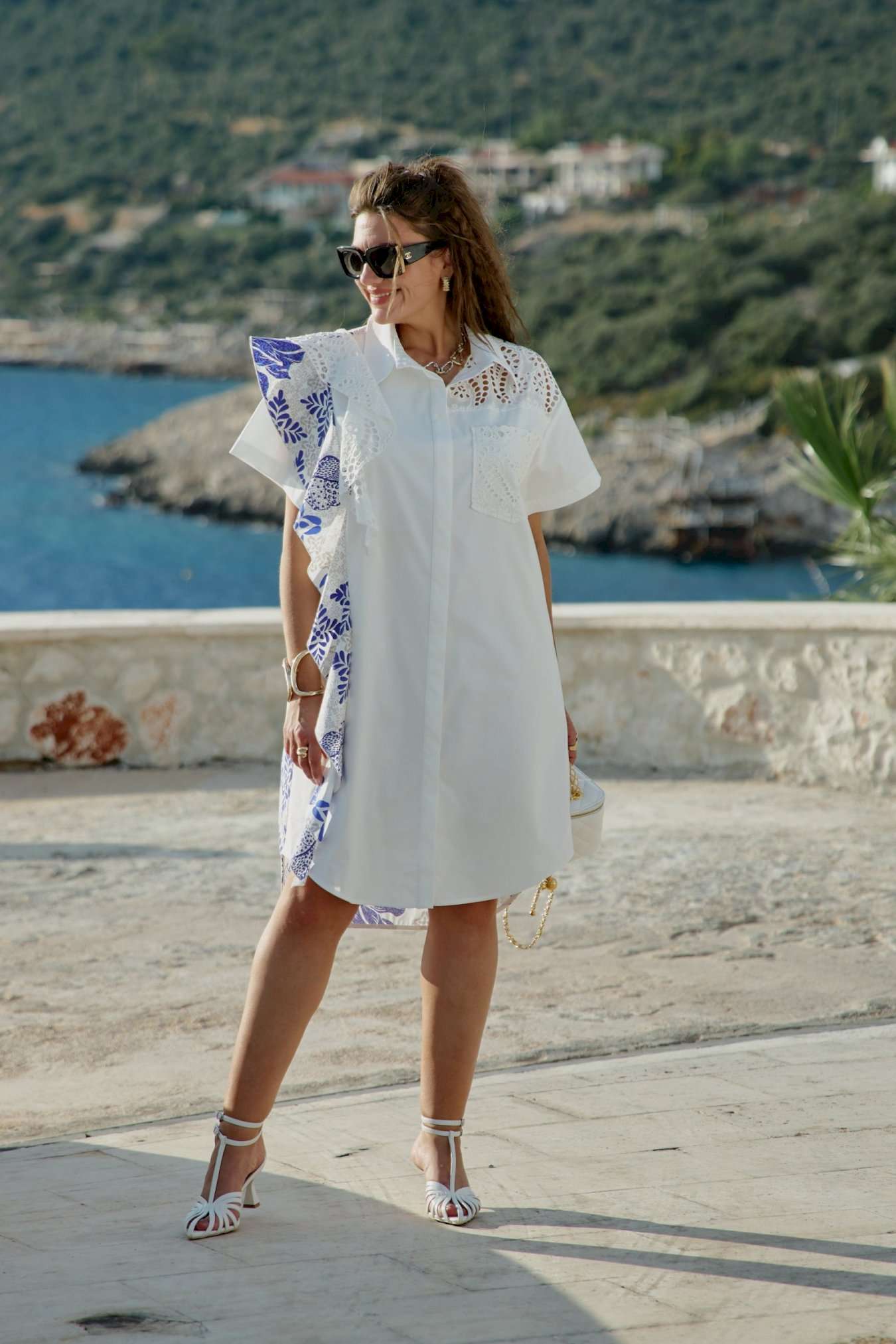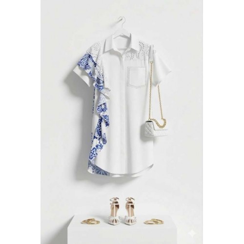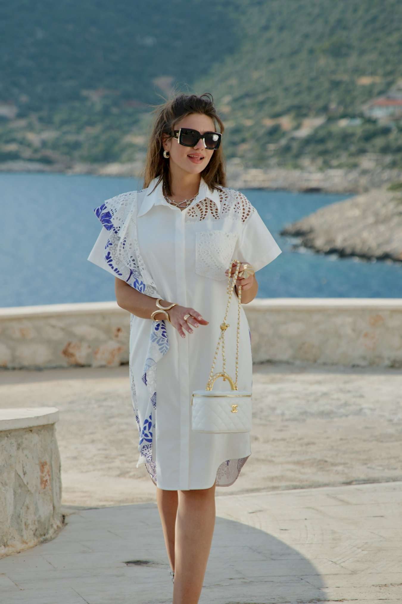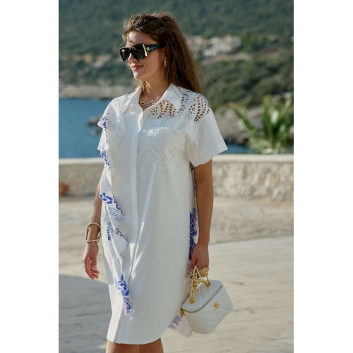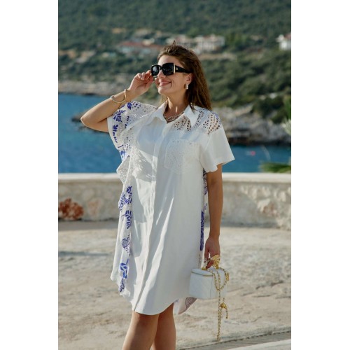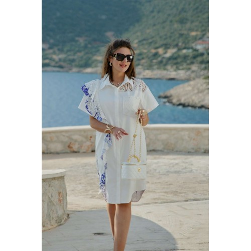 Платье - рубашка станет отличным дополнением в вашем гардеробе. Невероятно стильный комплект подчеркнет красоту вашей фигуры и скроет недостатки. Отличный вариант на лето, который также можно стилизовать делая образ ещё более ярким. Невероятно красивый яркий принт в гармоничном сочетании с белым оттенком в данной модели перенесёт Вас на юг Италии и создаст образ, который будет приковывать внимание. Платье-рубашка прямого силуэта, с центральной потайной застёжкой на петли-пуговицы по планке, отложным воротником рубашечного типа. По левой части полочки отрезная кокетка «на просвет», а также накладной карман из отделочной ткани — вышивки ришелье. По правой детали полочки платья декоративная двойная рюша переходящая на спинку платья из отделочных тканей— вышивки ришелье а так же ткани с акцентным принтом. Перёд платья на подкладке. Линия плеча в платье спущенная. Рукав втачной, короткий. Спинка в платье без особенностей, из отделочной ткани с акцентным принтом. Низ в платье фигурный, ассиметричный. Длина платья 110 см (р 50-54), 112,5 см (р 56-60).