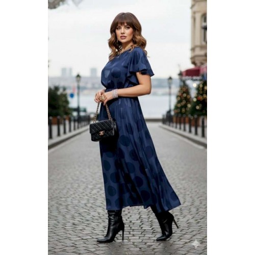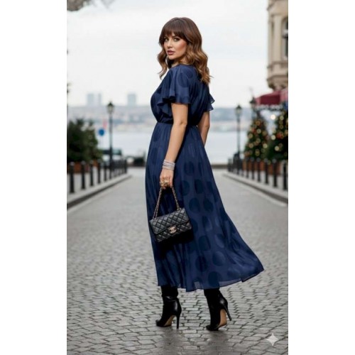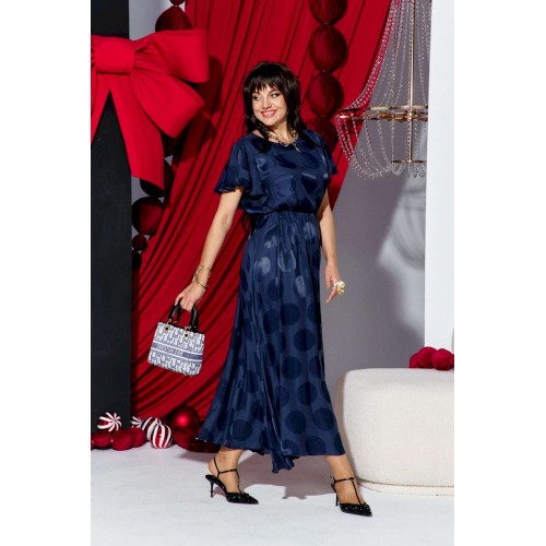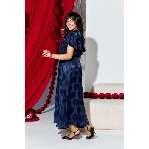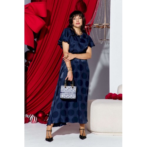 Платье для торжественных случаев в романтическом стиле из натуральной вискозы в сочетании с хлопковой нитью. Платье приталенного силуэта по геометрическому подобию напоминает трапецию, расширяющуюся к низу. Пластическая форма мягкая, плавная. Платье отрезное по линии талии. По лифу выполнены конструктивно-декоративные вертикальные подрезы от линии плеча до талии, а также застроченные складки у линии талии, направленные к плечу. По спинке в среднем шве выполнена застежка на петельку и пуговицу. Прилегание по талии достигнуто конструктивным подрезом, а также резиночкой. Плечевой пояс наклонный, мягко оформленный рукавом-воланом, выходящим из подреза лифа. Участок плотного прилегания по линии талии находится немного выше естественного уровня. Платье расширено по линии низа. Пройма по глубине и ширине умерена с характерным оформлением для комфортной эксплуатации. Покрой рукава короткий и приближен к волану. Стильное платье макси с идеальной посадкой по фигуре в тренде сезона подчеркивает женский элегантный образ. Платье удобное, современного фасона выполнено из качественных материалов. Вечернее платье станет идеальным вариантом для выхода в театр, концерт, торжественное мероприятие, фотосессию, вечеринку, торжественный вечер. Платье великолепно будет смотреться в ресторане, на юбилее, свадьбе, приеме, вручении премии «Оскар», «Гремми». Платье можно надеть на выпускной, на великосветскую тусовку. Длина платья 132 см, длина рукава 19 см.