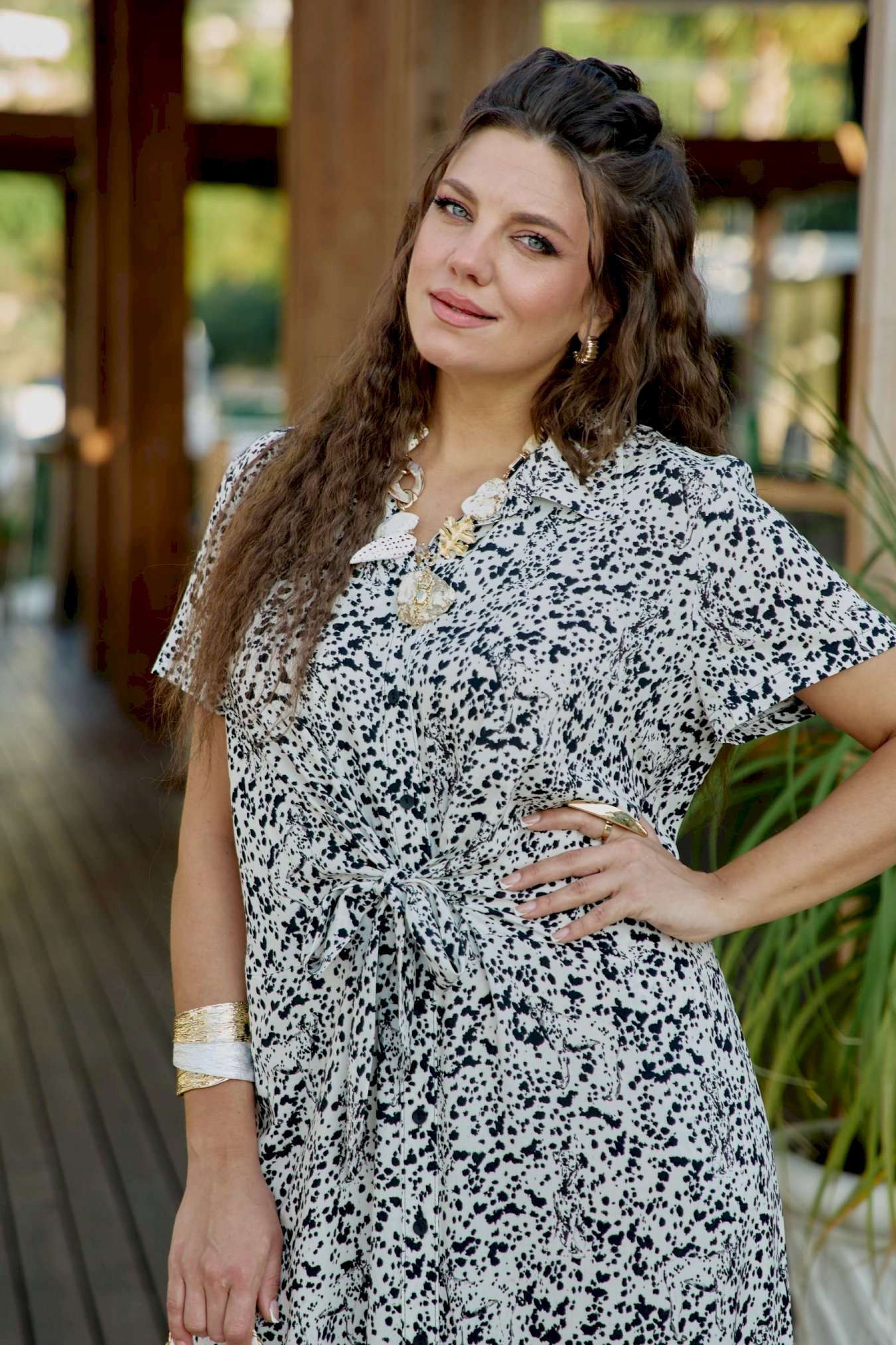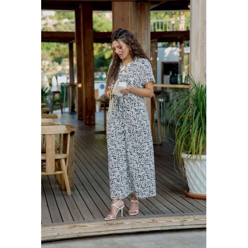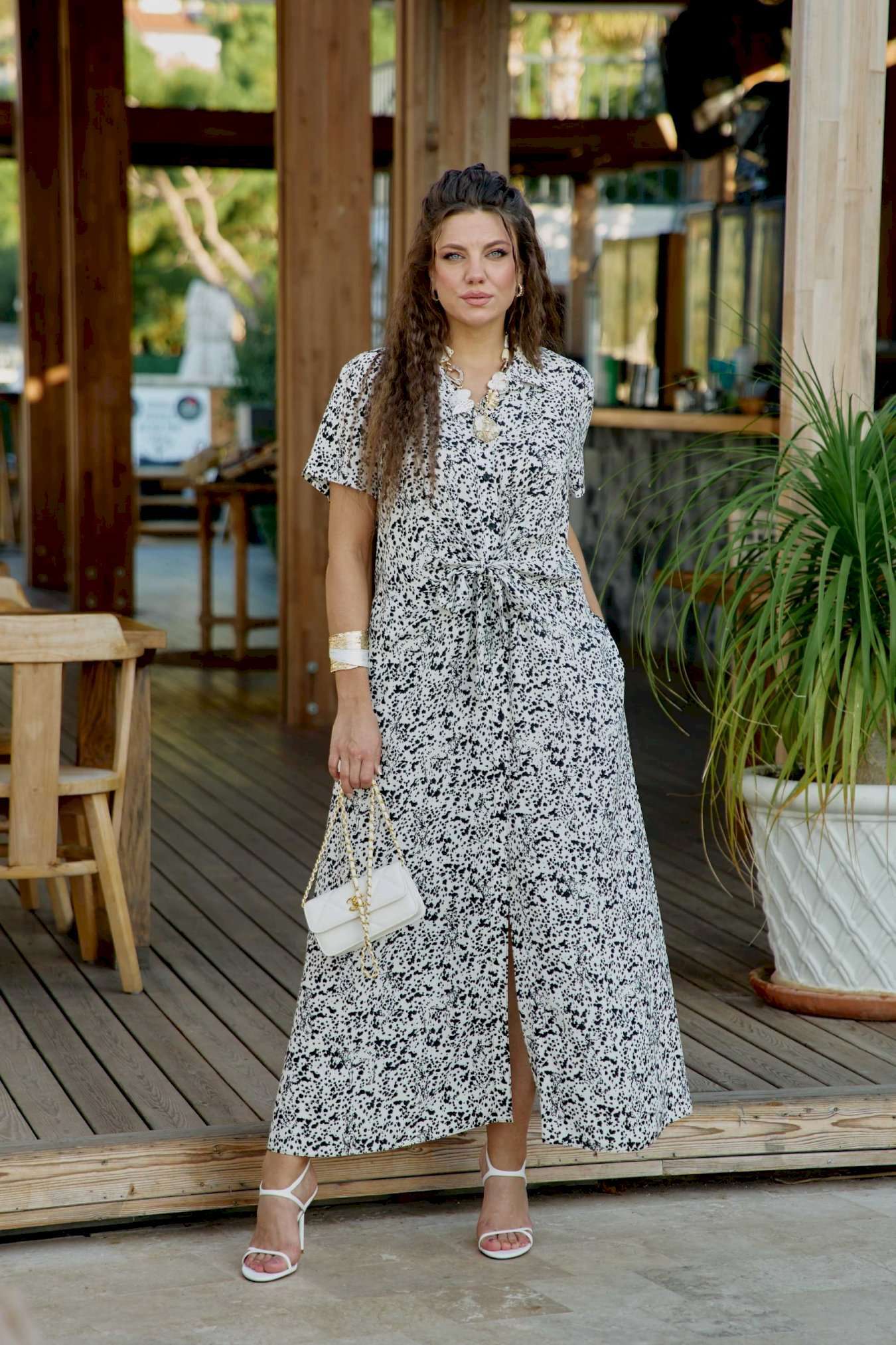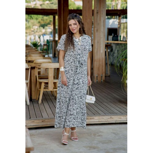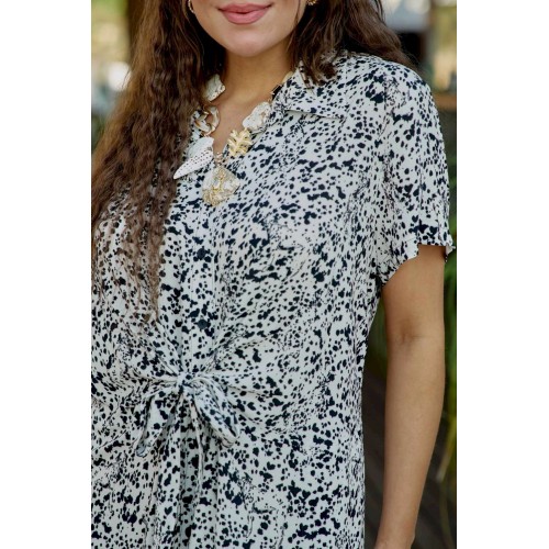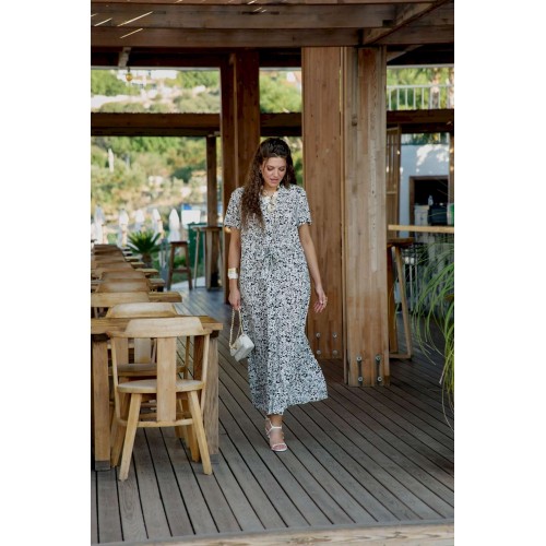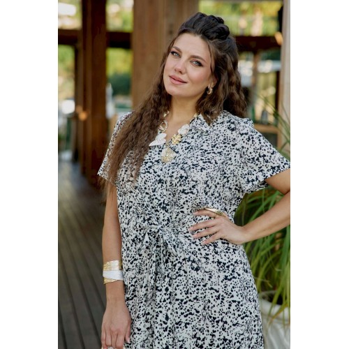 Платье женское летнее для повседневной носки в романтическом стиле небольшого объема полуприлегающего силуэта по геометрическому подобию напоминает трапецию и немного расширяется к низу. Платье распашное, перед выполнен с фигурным подрезом по талии из которого выходят завязки, формирующие на талии драпировку и декоративный узел. Застежка вертикальная на петли и пуговицы на притачной планке. Воротник на стойке рубашечного типа. Плечевой пояс наклонный естественной ширины с плавным переходом в линию рукава. Спинка цельнокроенная. Рукав втачной короткий. Платье без подкладки из 100% вискозы незаменимо в летнем гардеробе. Уникальный графический принт кокетливо скрывает в себе анималистичный рисунок, незаметный с первого взгляда на платье. Его удобно носить каждый день в жаркий день, а также легко сочетать с жакетом. Благодаря трендовому рисунку платье будет актуально и в последующие сезоны. Его удобно носить на прогулке, встречи, работу. Оно незаменимо в отпуске. Дышащий, натуральный материал создаст ощущение заботы о вашем образе и придаст уверенности в каждом движении. Длина платья 130 см (р 54-58), 131 см (р 60-64).