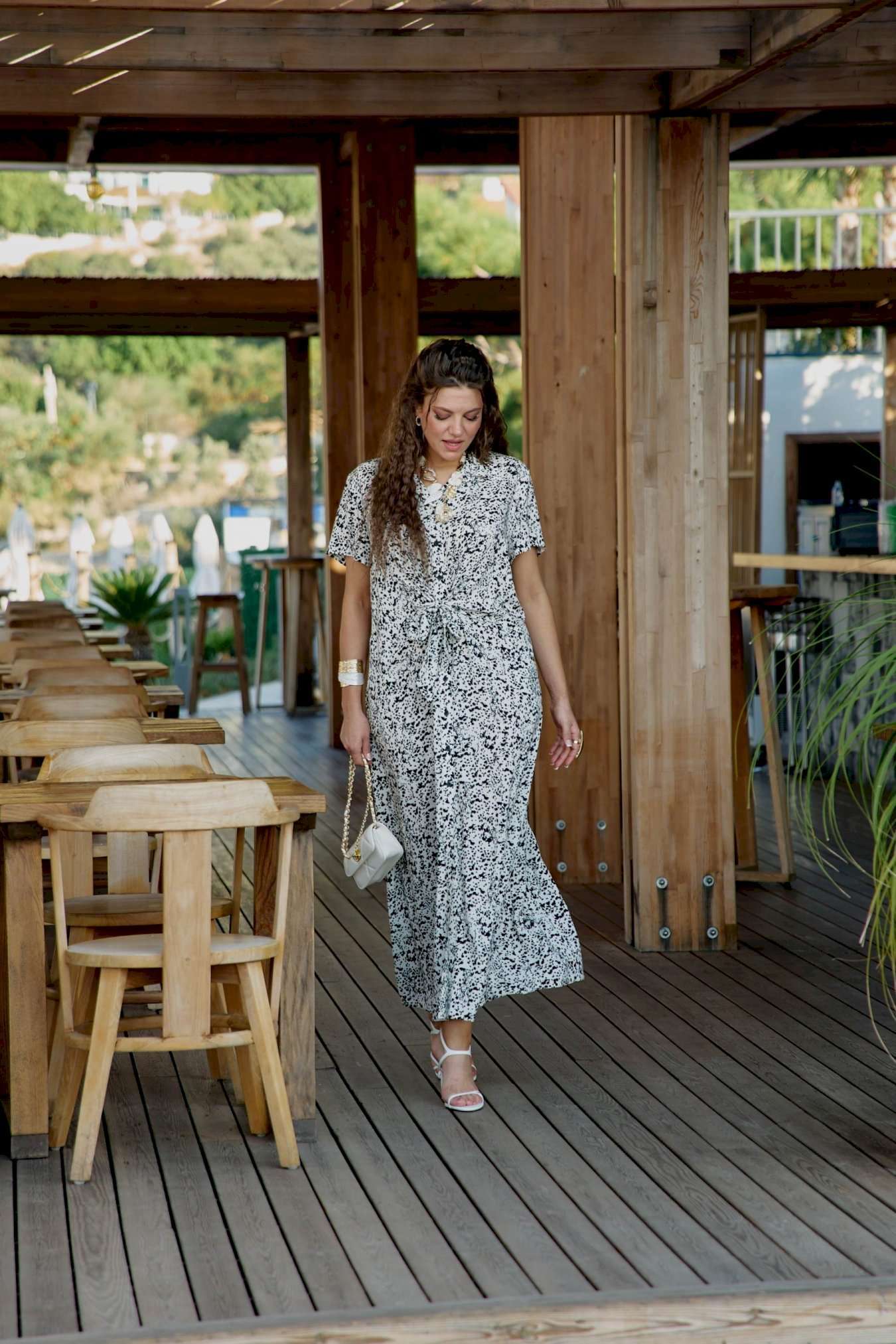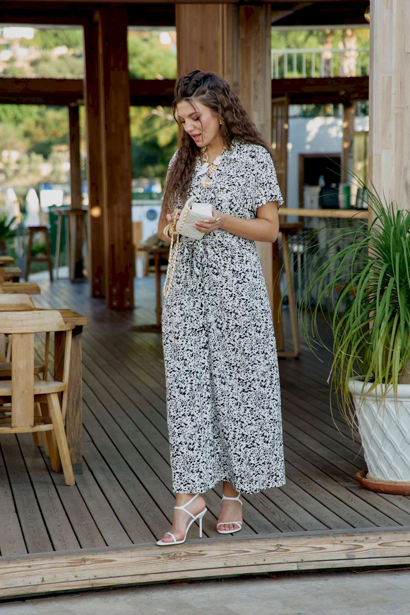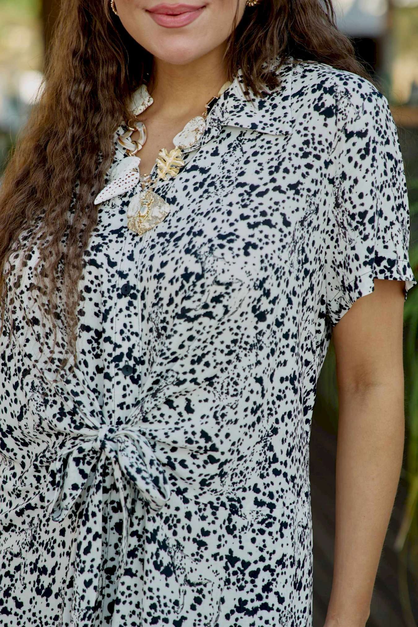 Платье женское летнее для повседневной носки в романтическом стиле небольшого объема полуприлегающего силуэта по геометрическому подобию напоминает трапецию и немного расширяется к низу. Платье распашное, перед выполнен с фигурным подрезом по талии из которого выходят завязки, формирующие на талии драпировку и декоративный узел. Застежка вертикальная на петли и пуговицы на притачной планке. Воротник на стойке рубашечного типа. Плечевой пояс наклонный естественной ширины с плавным переходом в линию рукава. Спинка цельнокроенная. Рукав втачной короткий. Платье без подкладки из 100% вискозы незаменимо в летнем гардеробе. Уникальный графический принт кокетливо скрывает в себе анималистичный рисунок, незаметный с первого взгляда на платье. Его удобно носить каждый день в жаркий день, а также легко сочетать с жакетом. Благодаря трендовому рисунку платье будет актуально и в последующие сезоны. Его удобно носить на прогулке, встречи, работу. Оно незаменимо в отпуске. Дышащий, натуральный материал создаст ощущение заботы о вашем образе и придаст уверенности в каждом движении. Длина платья 130 см (р 54-58), 131 см (р 60-64).