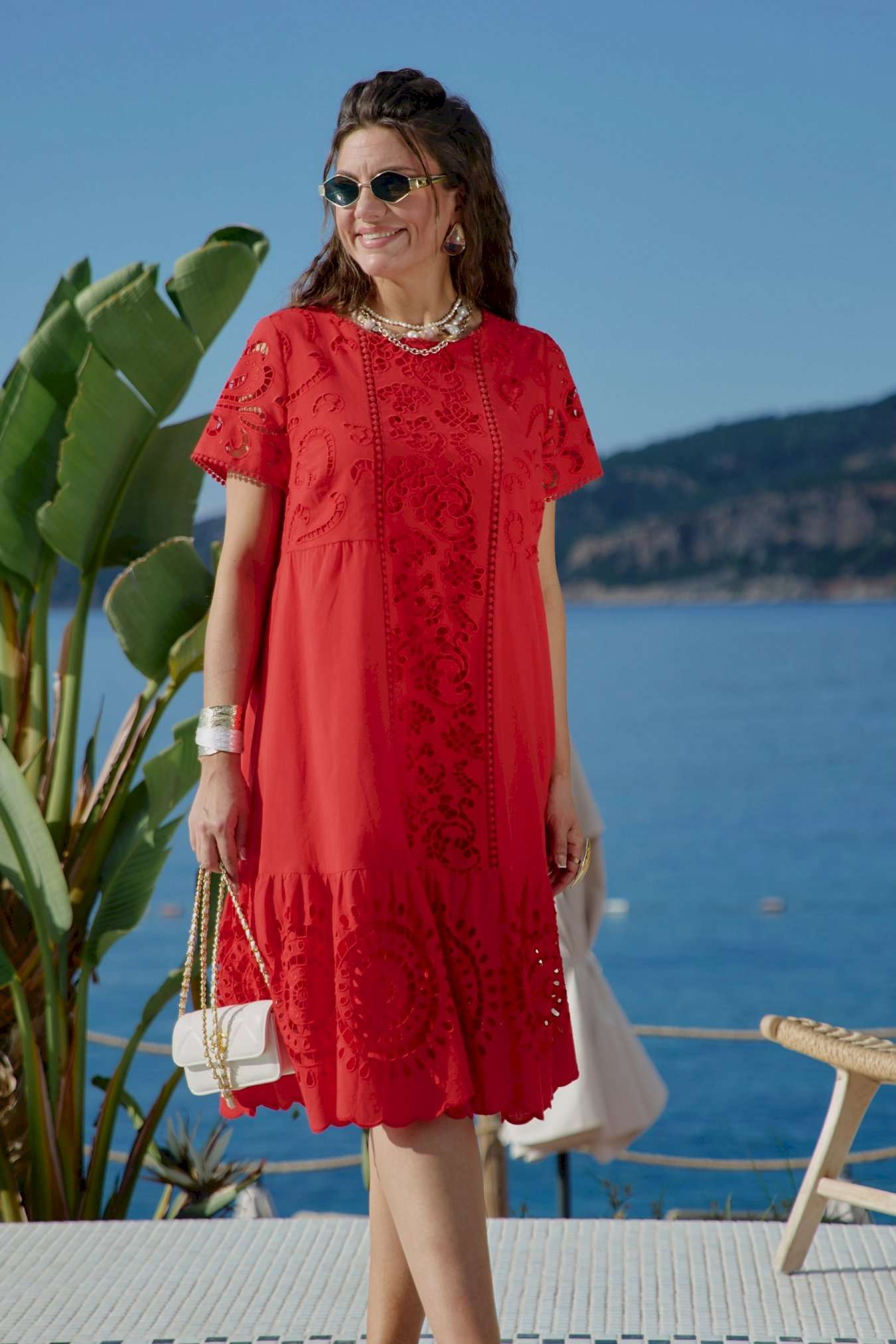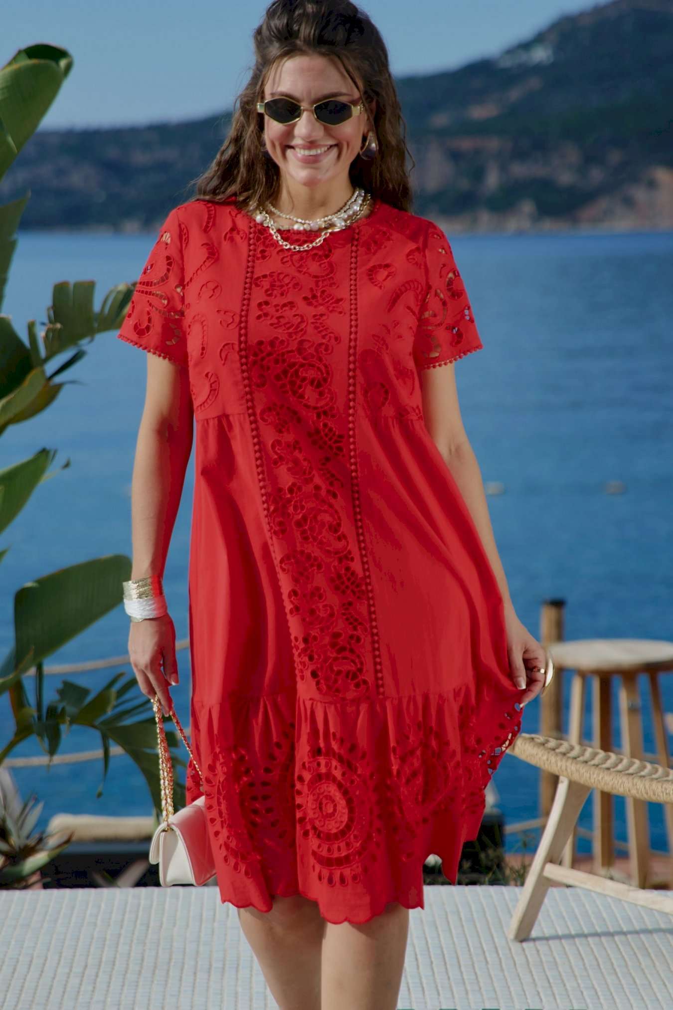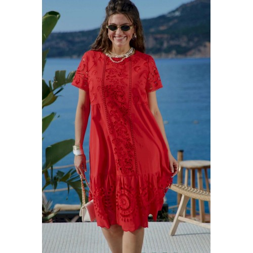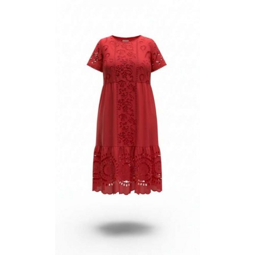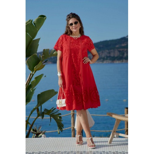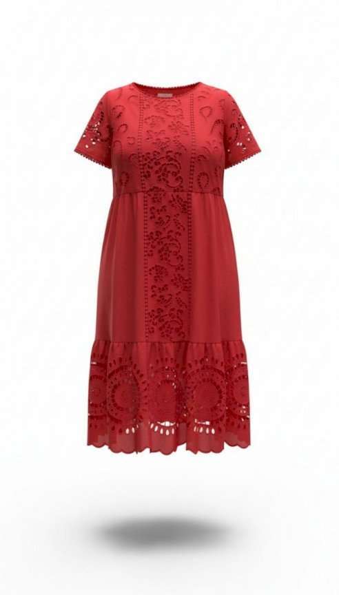 Это летнее платье в гармоничном сочетании ткани ришелье и однотона, составляет идеальную симфонию из легкости и романтики, оно будто символизирует безмятежные дни, наполненные нежностью лета. Легкая ткань, окутывающая фигуру, нежно струится при каждом движении, создавая ощущение воздушности. Это платье идеально подойдет для летнего дня — будь то прогулка по жаркому пляжу, ужину на террасе или торжественный праздник на свежем воздухе. В таком образе каждая женщина чувствует себя как настоящая фея лета. Огромным достоинством этого платья становятся вставки из ришелье — изысканного ажурного кружева. Платье свободного силуэта, с округлой формой горловины оформленной декоративным кружевом; вставкой из ришелье по центру платья с декоративным кружевом по краям. Платье с подрезом выше уровня талии со сборкой от подреза, лиф из ришелье. Спинка с вставкой из ришелье по кокетке и сборкой от подреза. Рукав в платье втачной из ришелье на просвет, с кружевом по низу. По низу платья притачной волан из ришелье с фестонами по низу и сборкой от подреза. Длина платья от высшей плечевой точки до низа 107 см(р.50-54), 108,5 см (р.56-60), длина рукава 20 см.