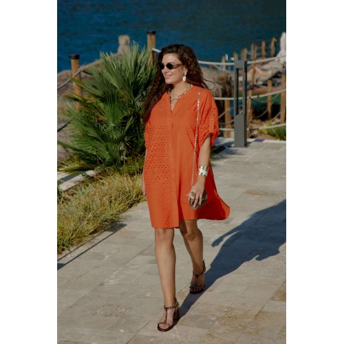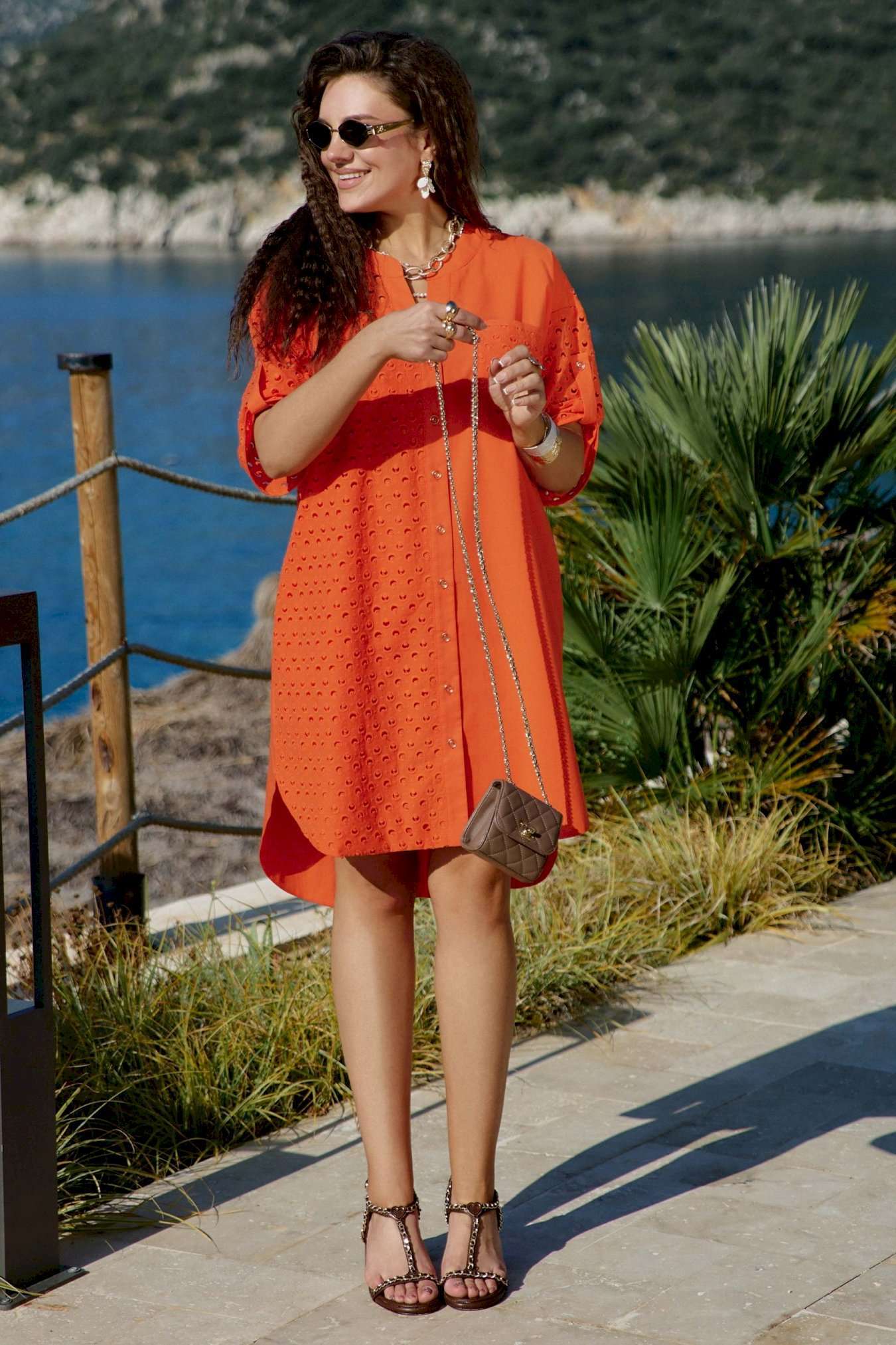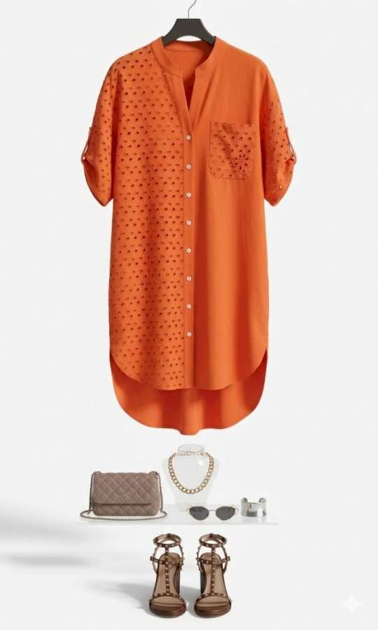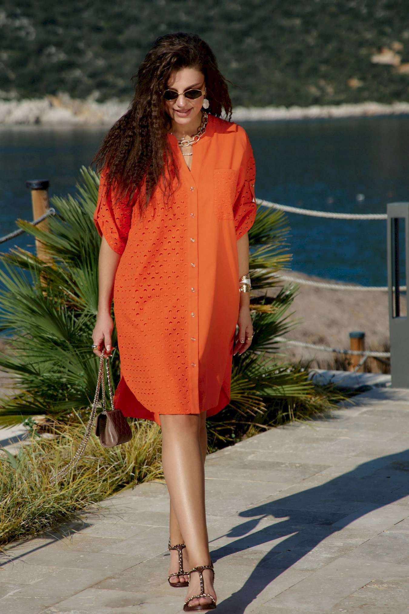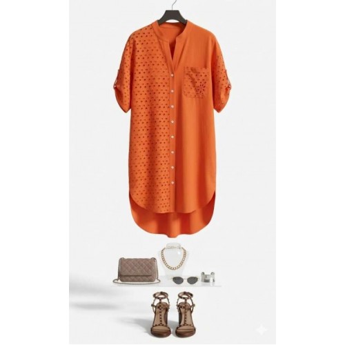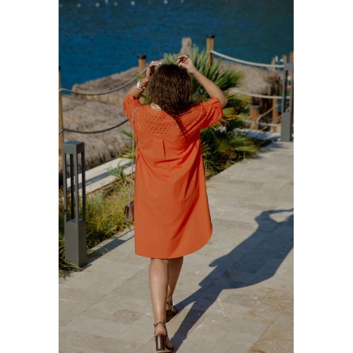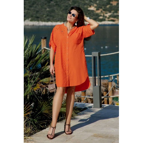 Платье-рубашка станет отличным дополнением в вашем гардеробе. Невероятно стильный комплект подчеркнет красоту вашей фигуры и скроет недостатки. Отличный вариант на лето, который так же можно стилизовать с другими вещами вашего гардероба. Платье прямого силуэта со спущенной линией плеча, округлой формой горловины, прилегающей стойкой. По переду платья центральная застёжка на петли пуговицы. Правая деталь переда платья из отделочной ткани ришелье с отрезной кокеткой «на просвет», и накладным карманом по левой детали. Спинка в платье с кокеткой из отделочной ткани – ришелье и складкой от подреза; в качестве дополнительного декоративного элемента по спинке отделка в виде пришивной нашивки. Рукав втачной с декоративной патой и пуговицей. Низ в платье ассиметричный, в боковых швах платья карманы. Длина платья 107 см. Длина рукава 19 см.