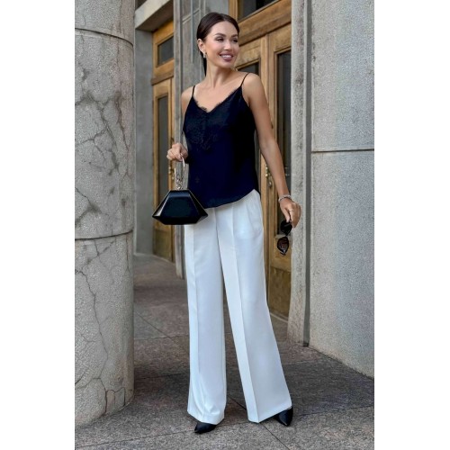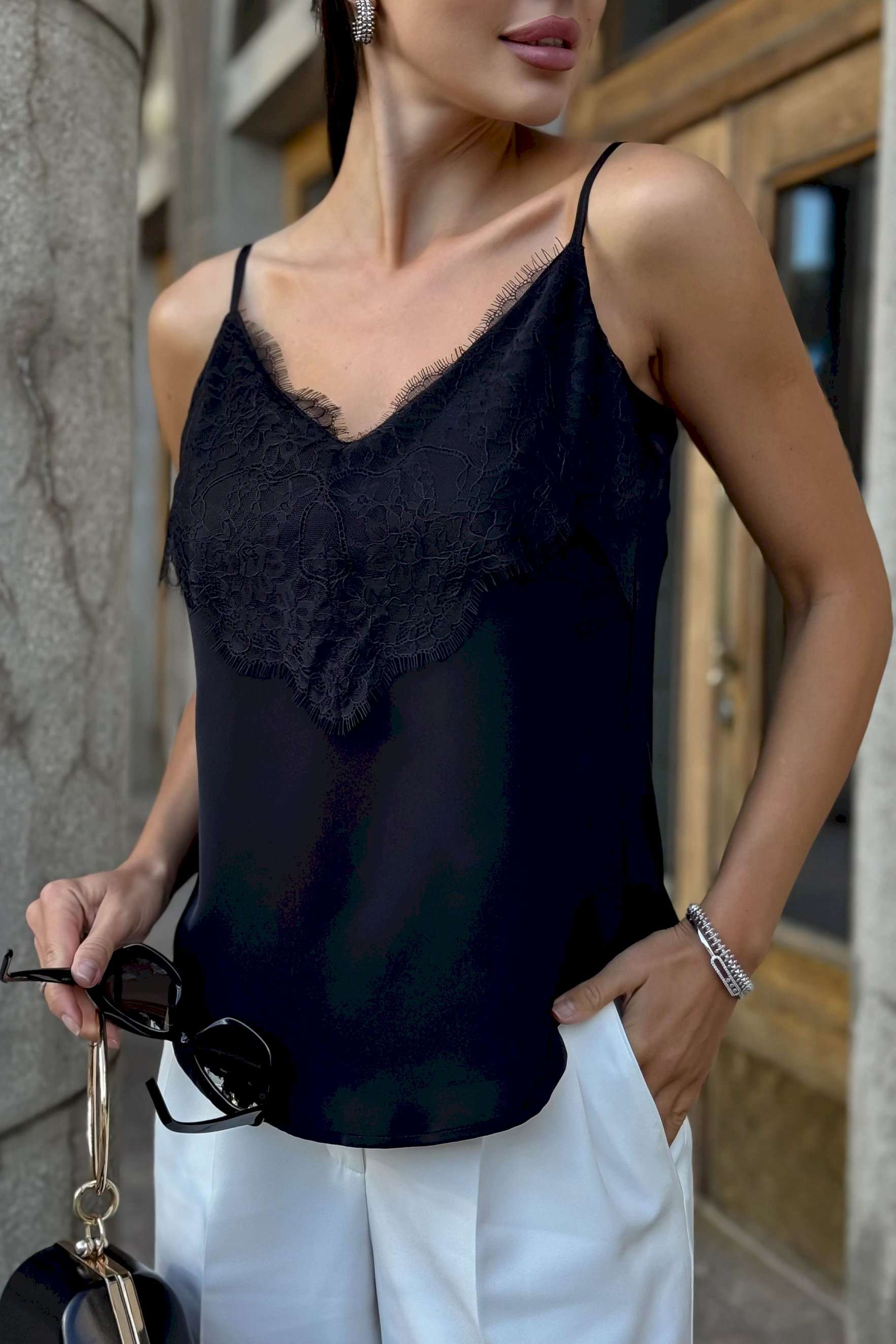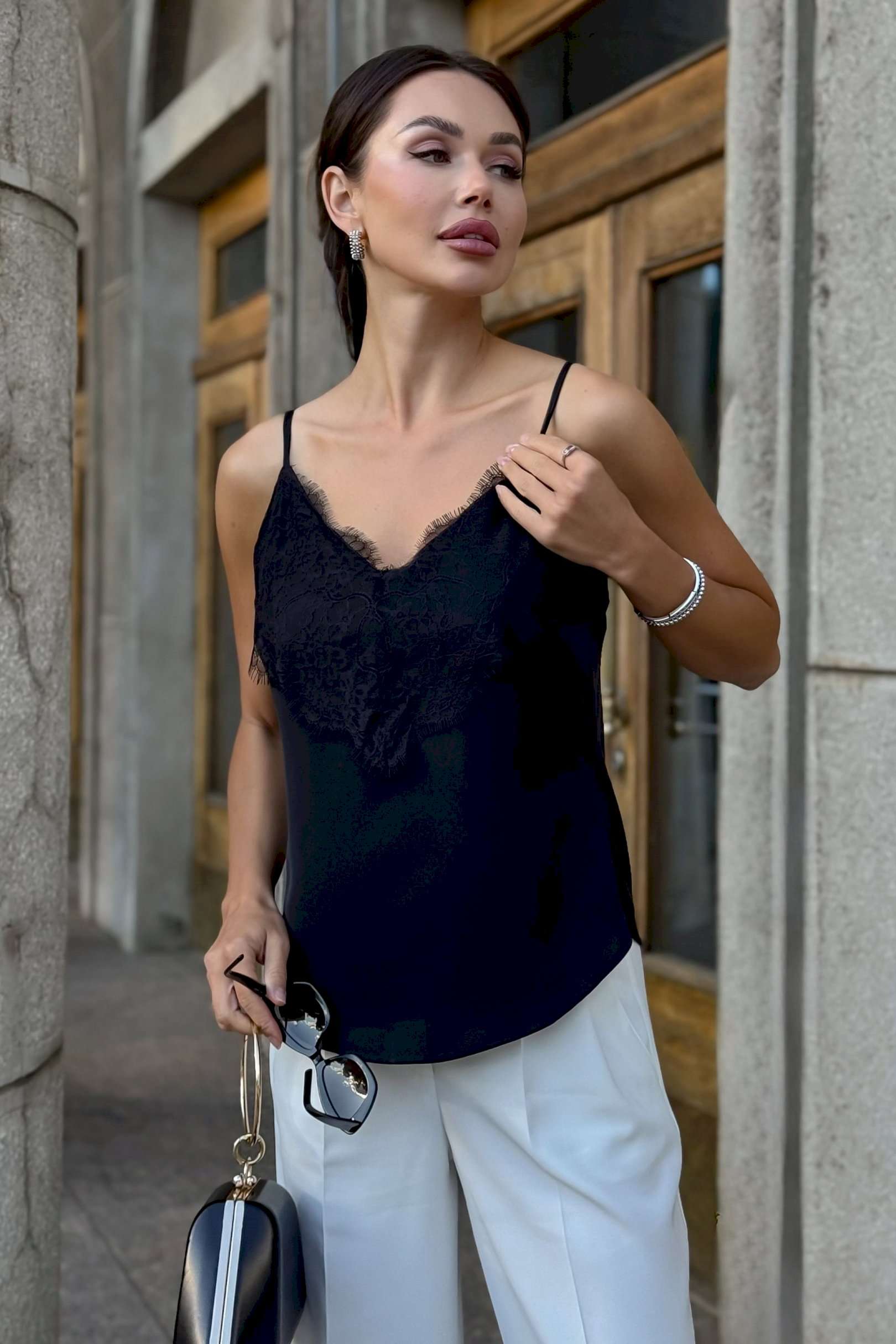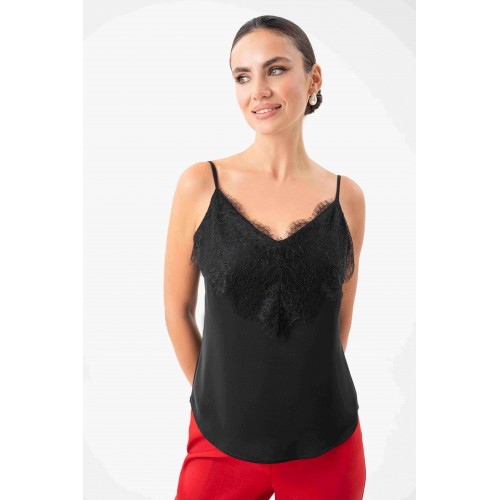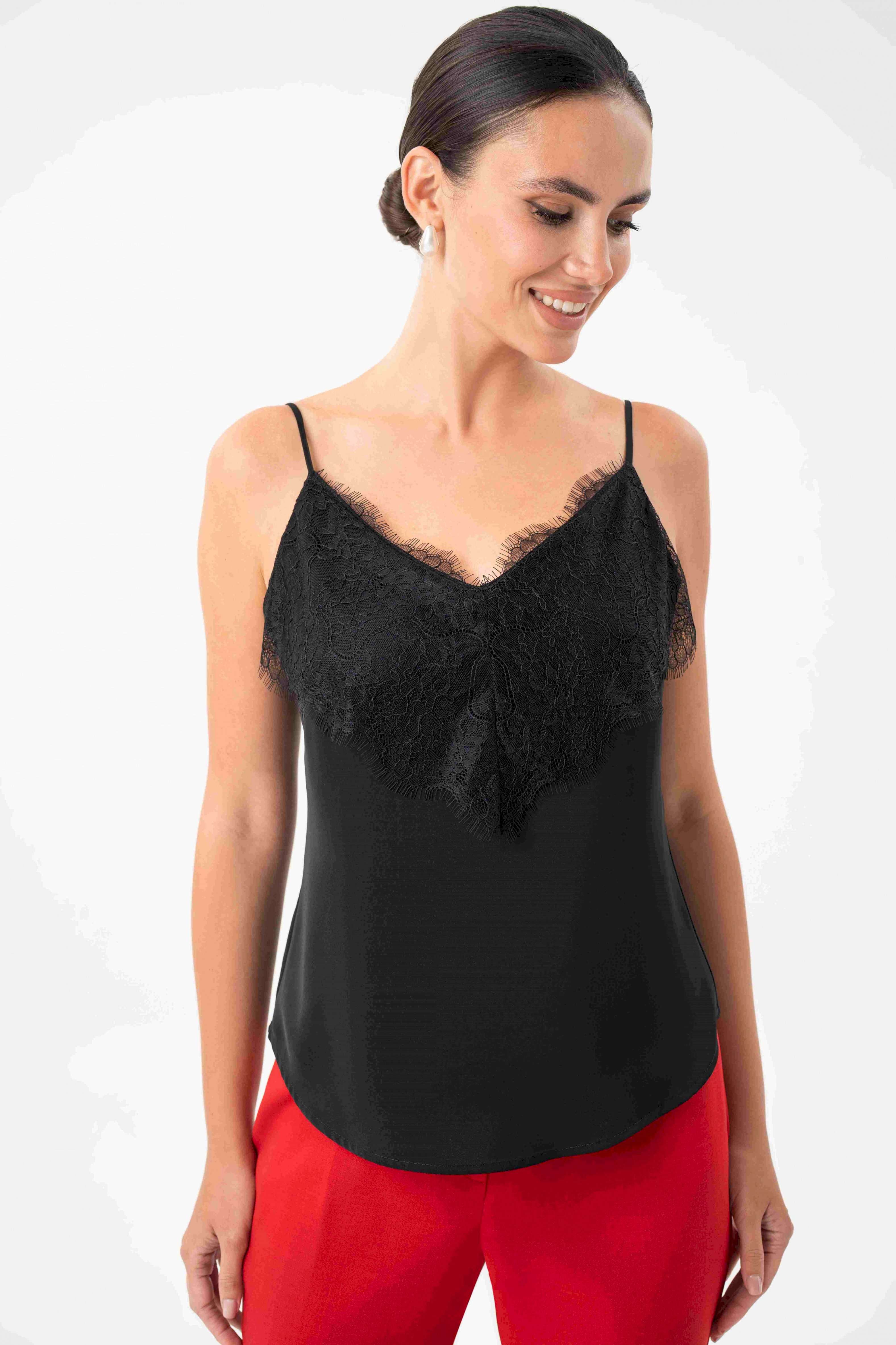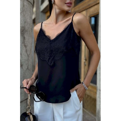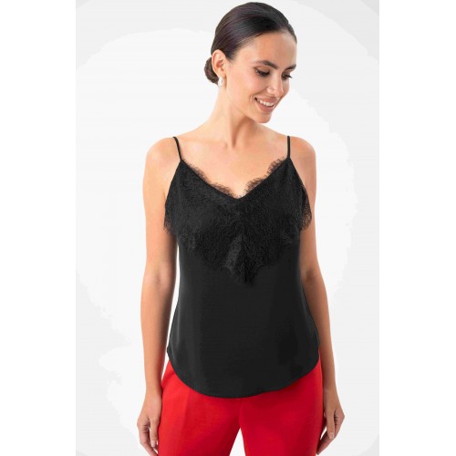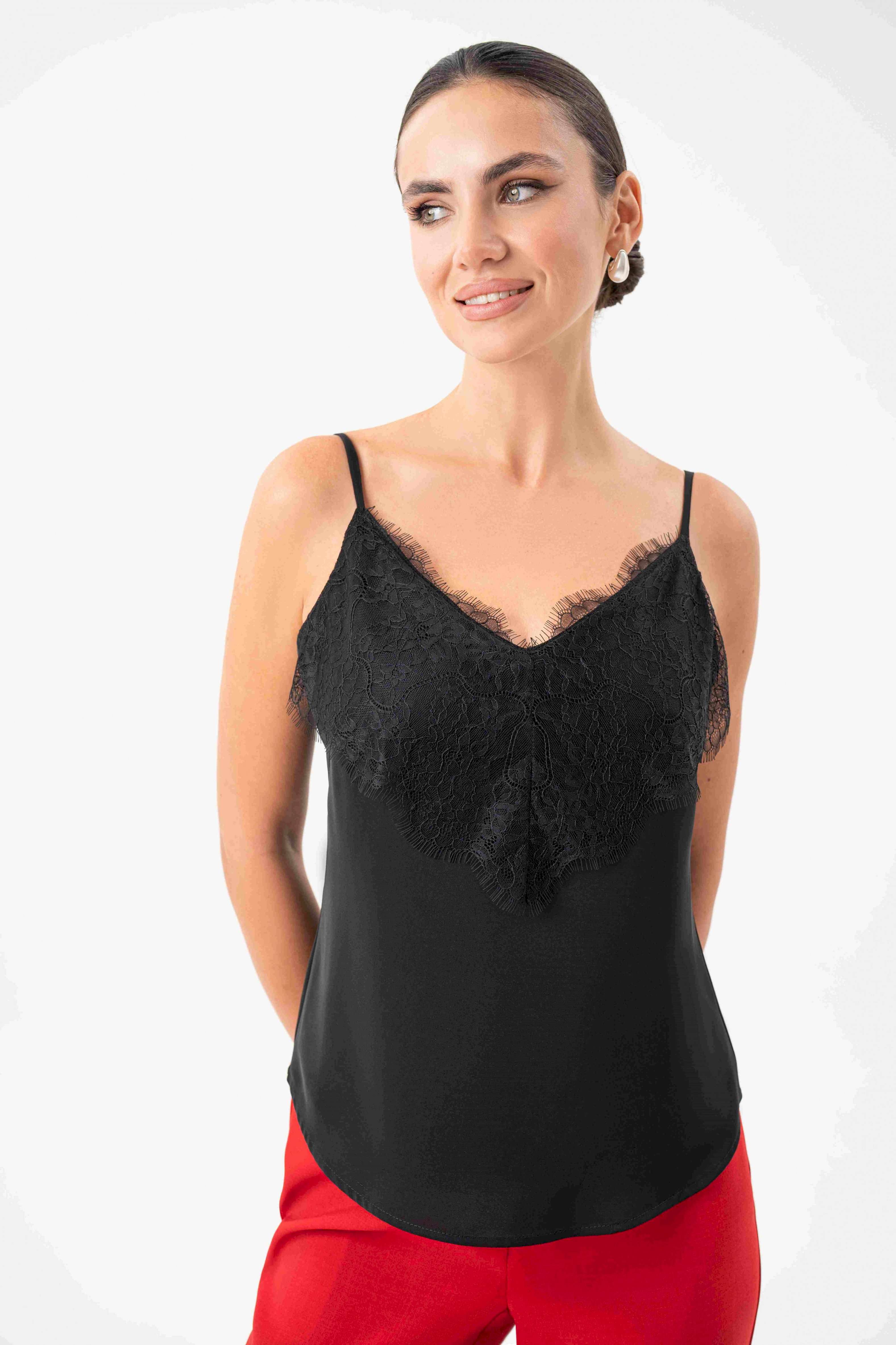 Топ с кружевом URS — это воплощение элегантности, женственности и безупречного вкуса. Такой топ станет универсальной базой в гардеробе современной женщины, которая ценит стиль и комфорт. Легкий и изысканный, он подчеркивает утонченность образа и гармонично вписывается как в деловой, так и в вечерний стиль. Блузка женская ЮРС, на бретелях, полуприлегающего силуэта, выполнена из блузочной ткани на подкладке, может быть как нарядная, так и повседневная. Перед с нагрудными вытачками, выходящими из боковых швов. Верхняя часть переда декорирована кружевом. Низ переда и спинки фигурной формы: короче у боковых швов, длиннее к центрам. Тип ткани Блузочная.