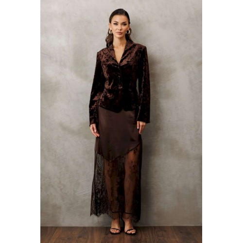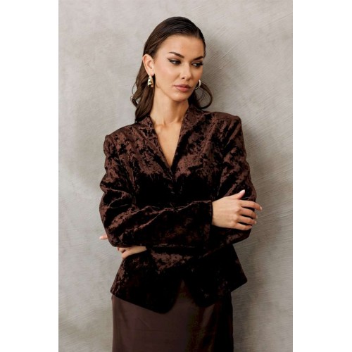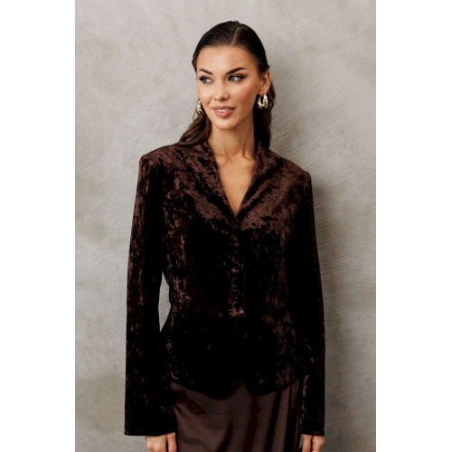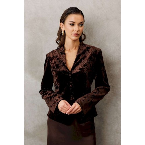 Жакет из велюровой ткани полуприлегающего силуэта, с втачным двухшовным рукавом. Полочка и спинка с отрезной баской по линии талии. Полочка с V-образным вырезом, однобортной застежкой на петли пуговицы и талиевой вытачкой от баски. Спинка с центральным швом. Жакет с отрезным бочком, переходящим на полочку и на спинку. Жакет на подкладке.