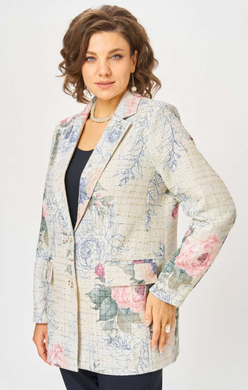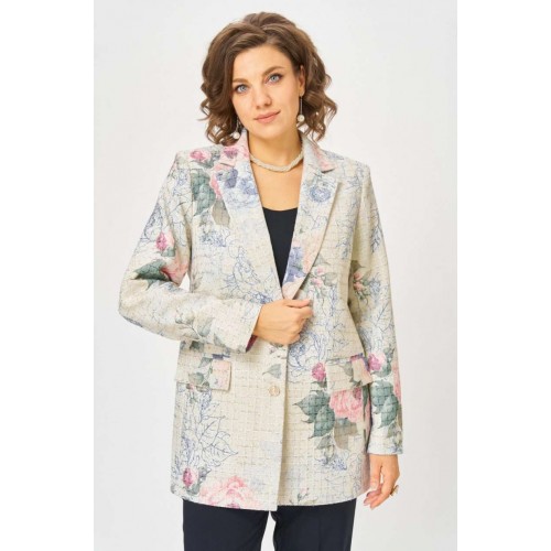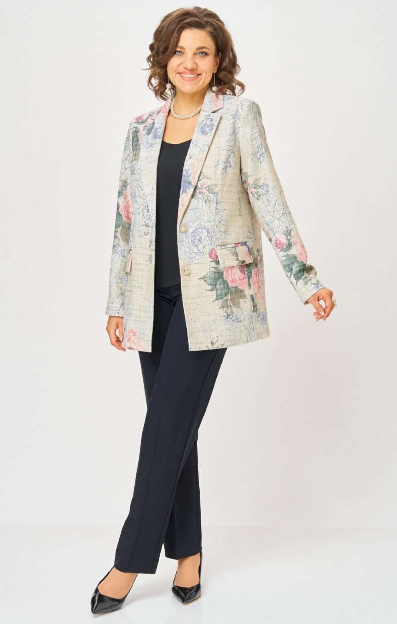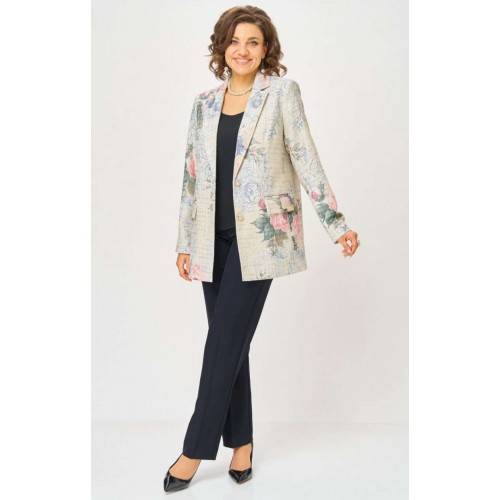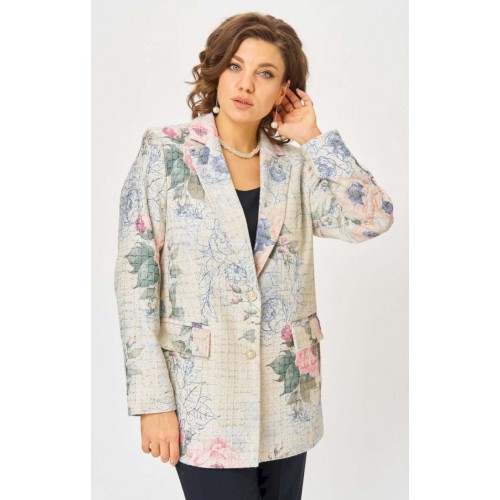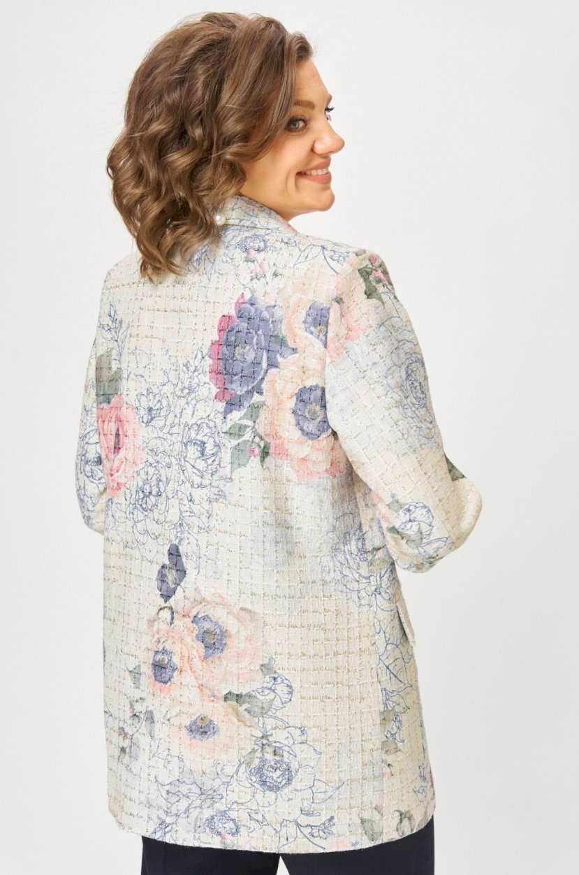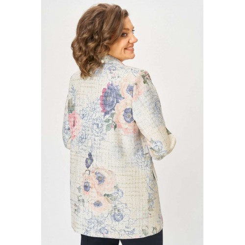 Жакет удлиненный, из твида, свободного силуэта с центральной бортовой застежкой на пуговицы до линии перегиба лацкана. По переду имеется отрезной бочок и вертикальные вытачки. С прорезными карманами с клапаном и двумя обтачками. Спинка цельная. Воротник пиджачного типа. Рукав двухшовный, втачной. Жакет на подкладке. Длина рукава 63 см, длина по спинке 75 см.