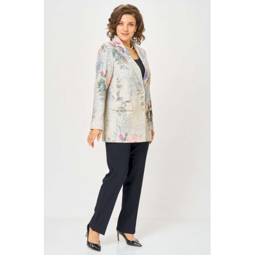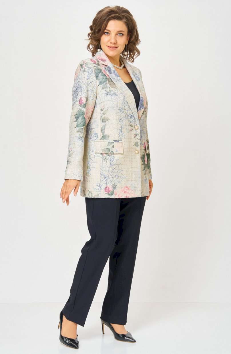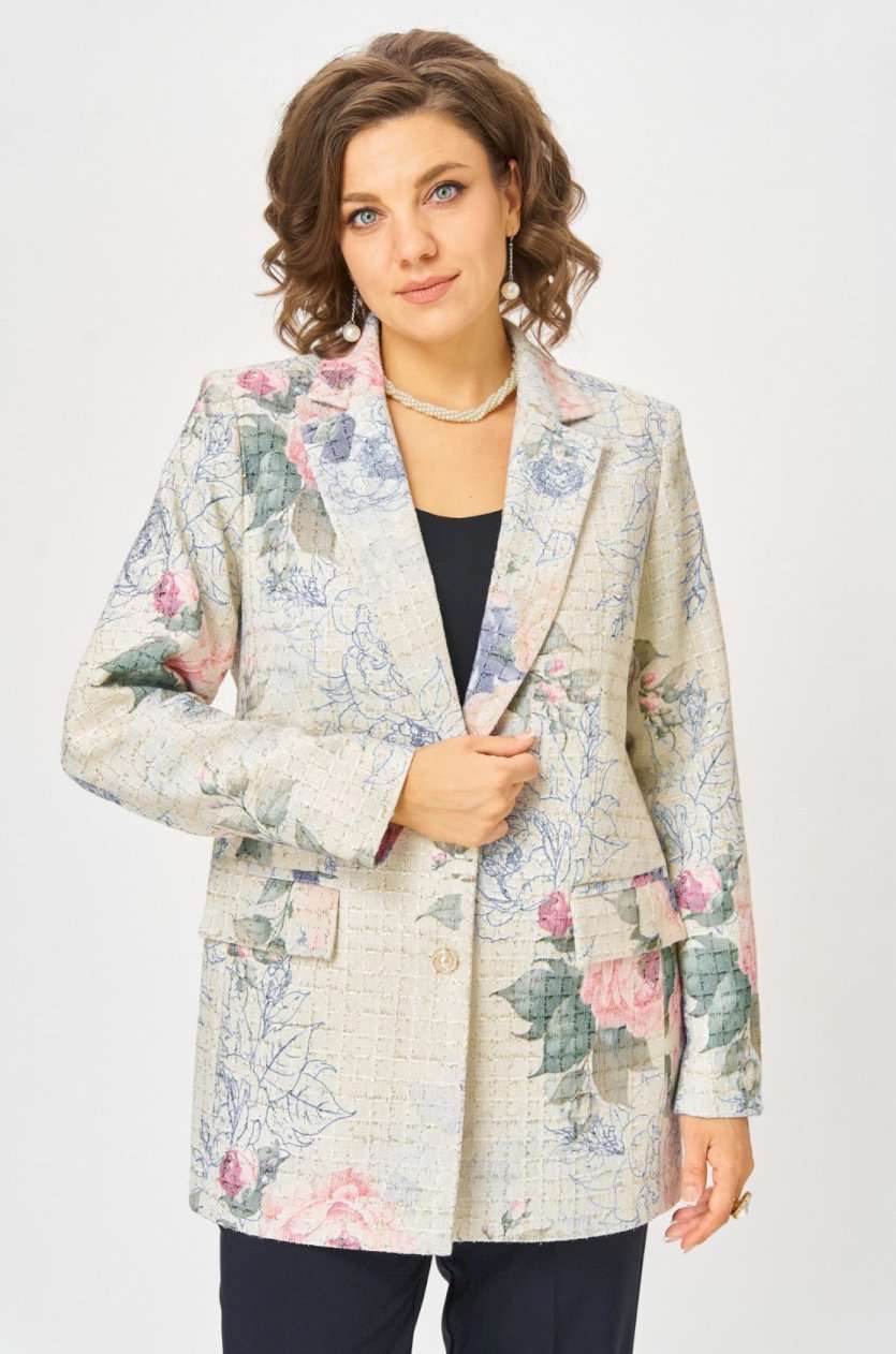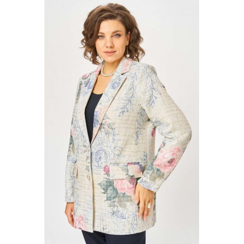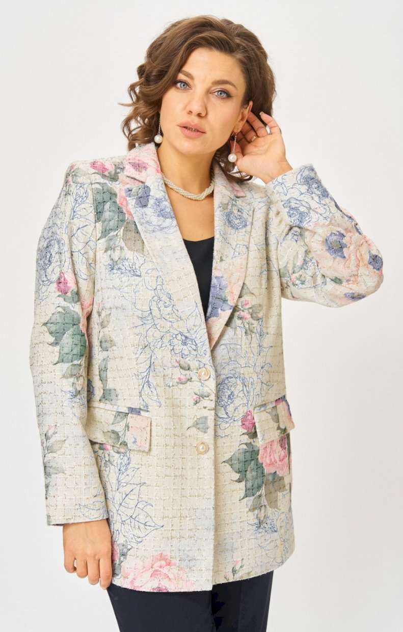 Жакет удлиненный, из твида, свободного силуэта с центральной бортовой застежкой на пуговицы до линии перегиба лацкана. По переду имеется отрезной бочок и вертикальные вытачки. С прорезными карманами с клапаном и двумя обтачками. Спинка цельная. Воротник пиджачного типа. Рукав двухшовный, втачной. Жакет на подкладке. Длина рукава 63 см, длина по спинке 75 см.