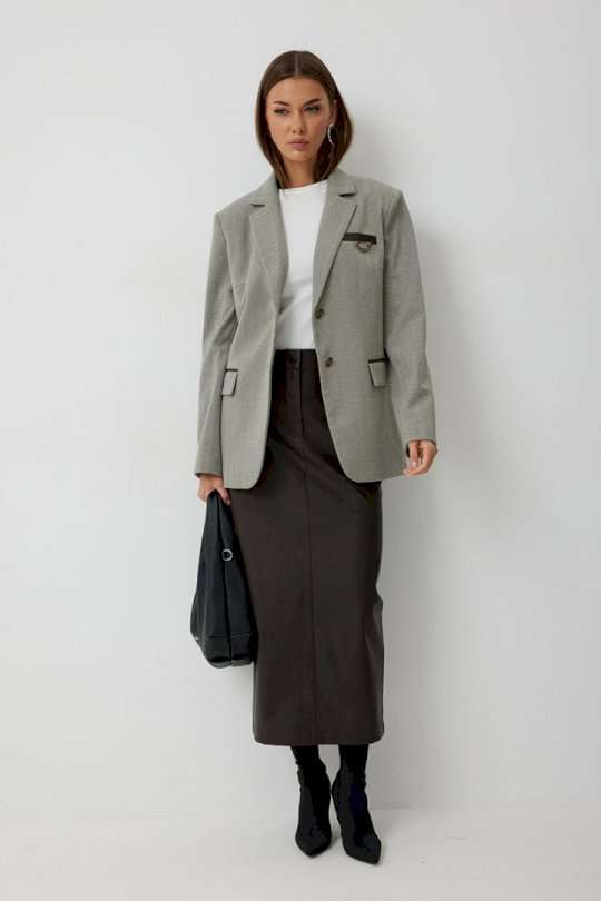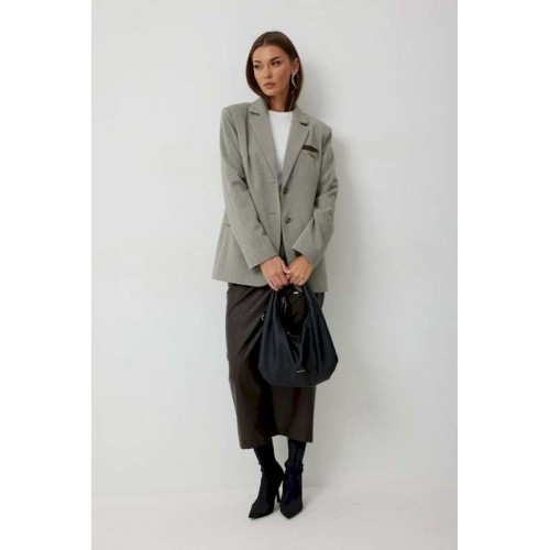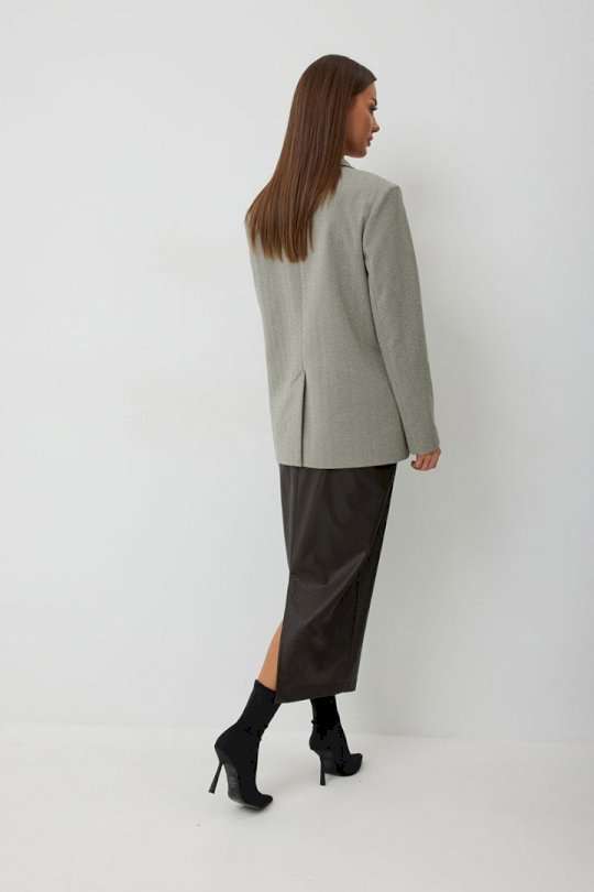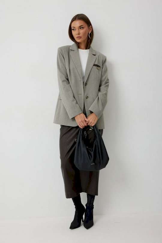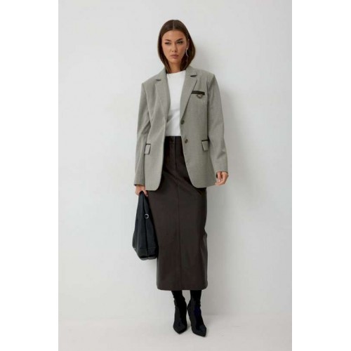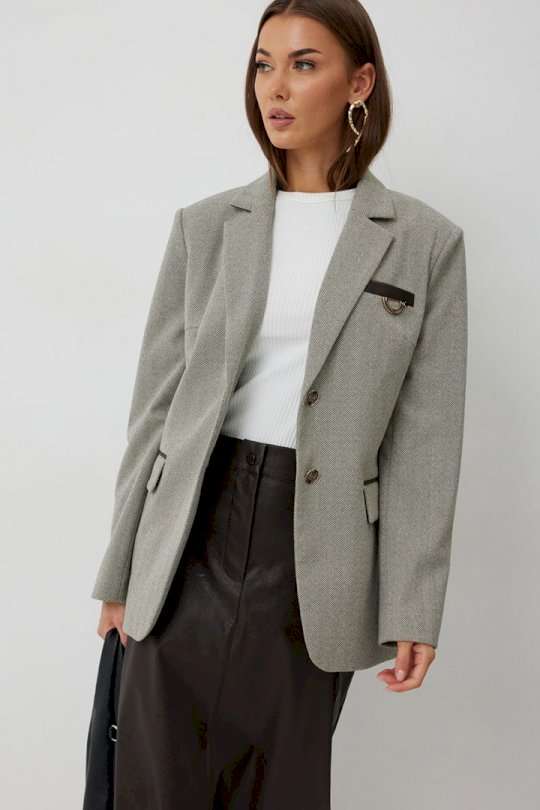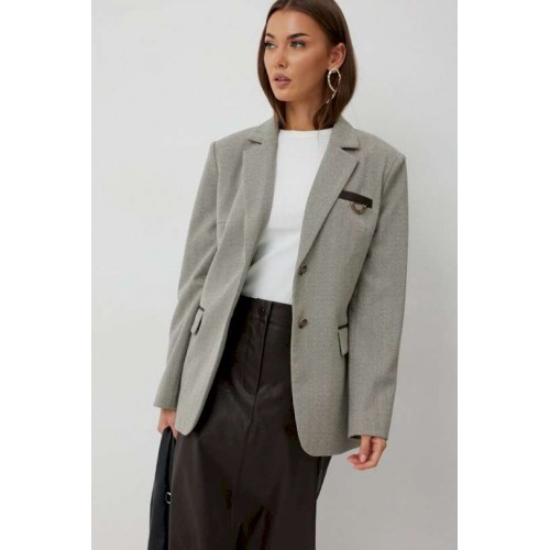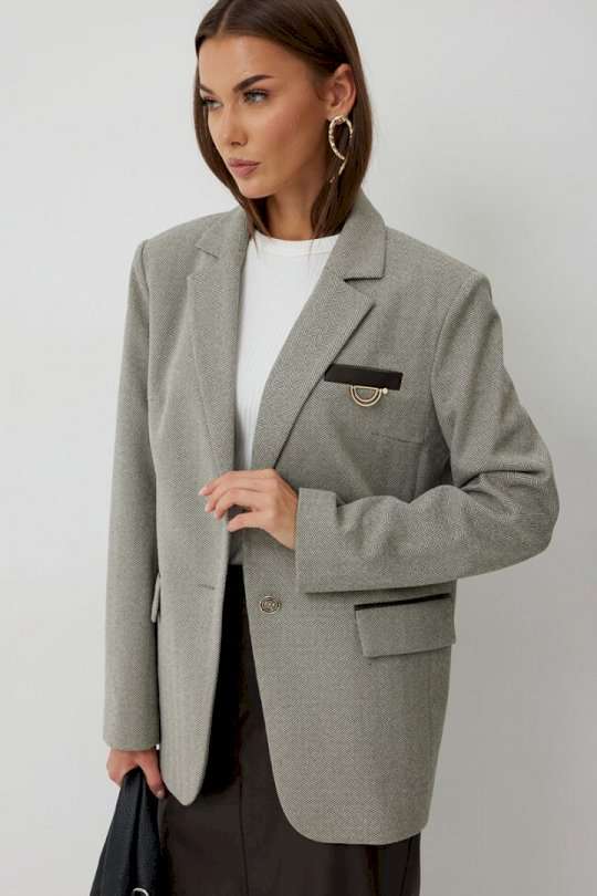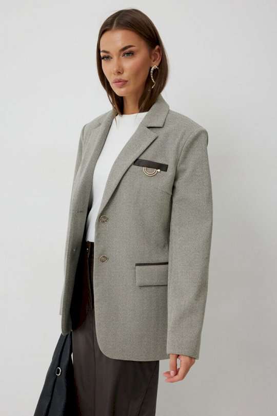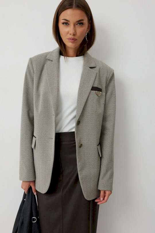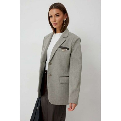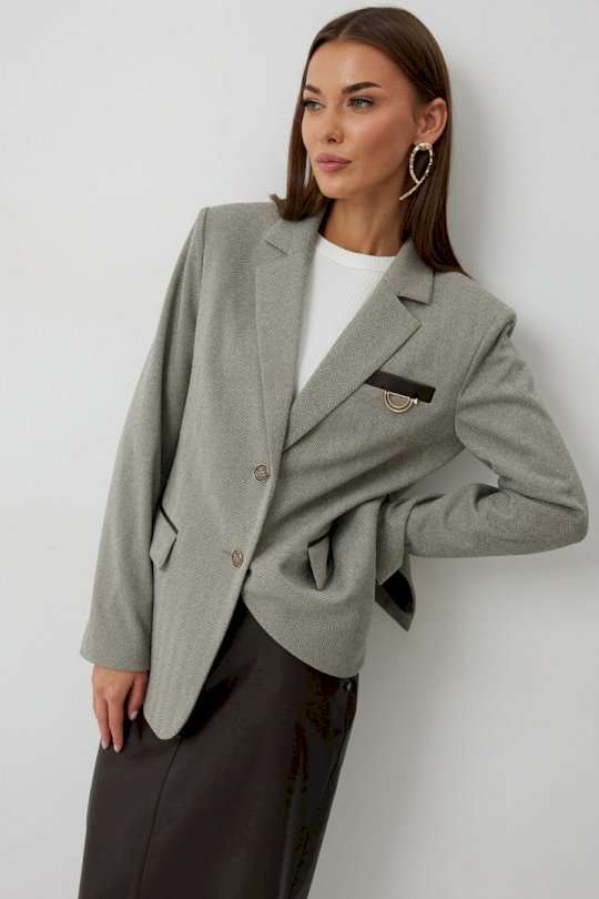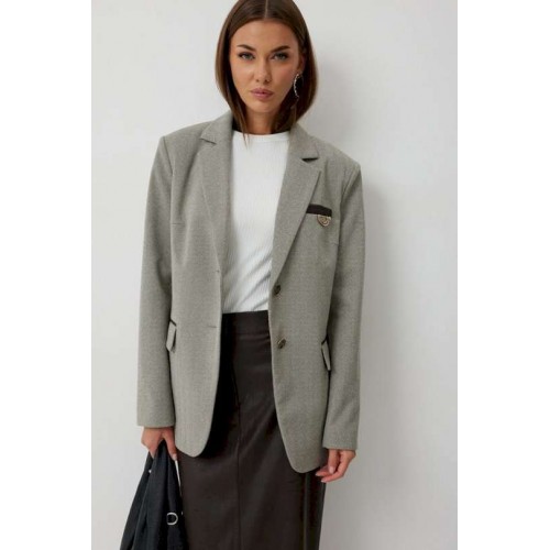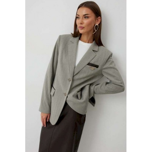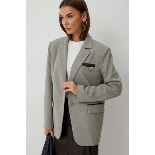 Жакет женский однобортный на подкладке прямого силуэта из трикотажной ткани. На передних частях жакета отрезной бочок с нагрудными вытачками. Обработаны прорезные карманы «в рамку» с клапаном. На левой части переда обработан карман с листочкой и декоративной пришивной деталью. Листочка, рамки кармана и нижний воротник выполнены из искусственной кожи. Спинка со шлицей в среднем шве. Рукав втачной двухшовный. Горловина обработана втачным воротником с отложными лацканами. Низ передних частей имеет закругленную форму. Жакет застегивается н а 2 декоративный пуговицы. Длина жакета по спинке 71 см см, Длина рукава 64 см.