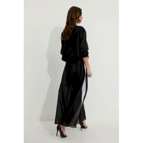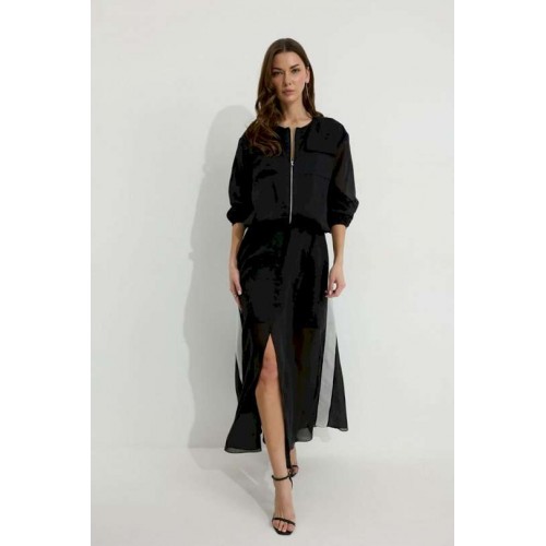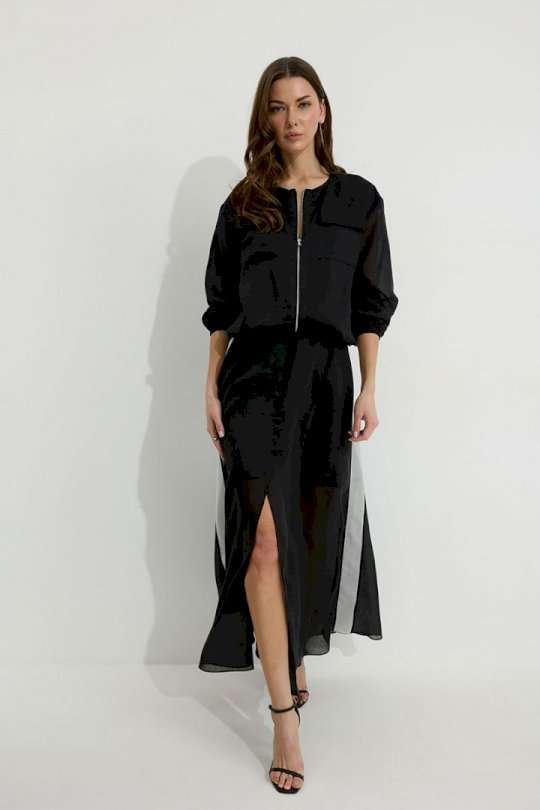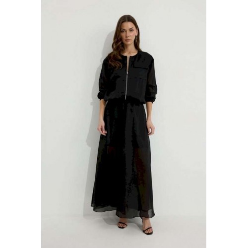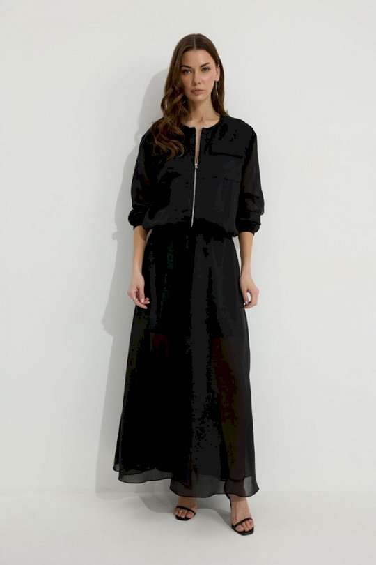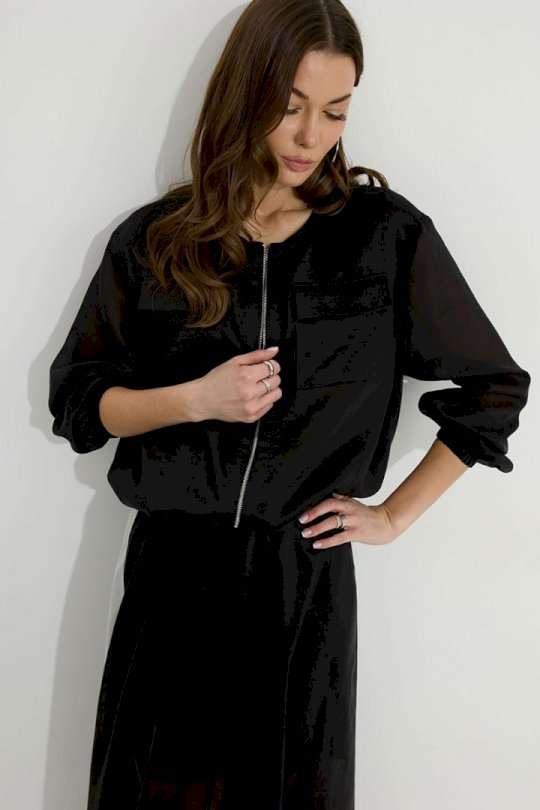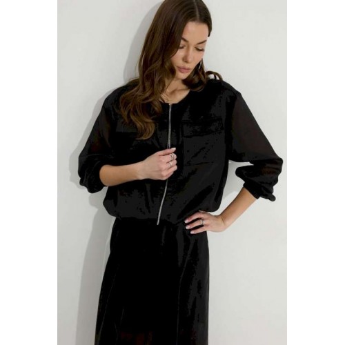Бомбер из вискозной полупрозрачной ткани. Свободного, расширенного силуэта, со спущенной линией плеча. Горловина овальной формы. По нижнему срезу изделия по переду и спинке складки и небольшая сборка на резинку. По переду отрезные планки, застежка на металлическую молнию. На уровне линии груди накладные карманы с клапанами. Рукав длинный, по нижнему срезу с резинкой. Перед и спинка изделия на подкладке из основной ткани. Обращаем Ваше внимание, что фурнитура может незначительно отличаться от фото. Подходит на рост 164-170 см. Длина жакета (44-48р 56 см) (50-54р 61 см). Длина рукава от горловины (44-48р 75 см) (50-54р 76 см).