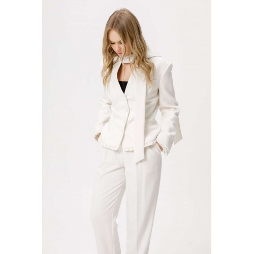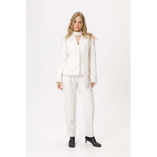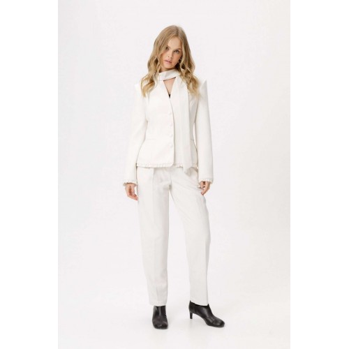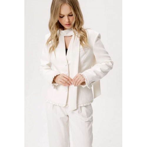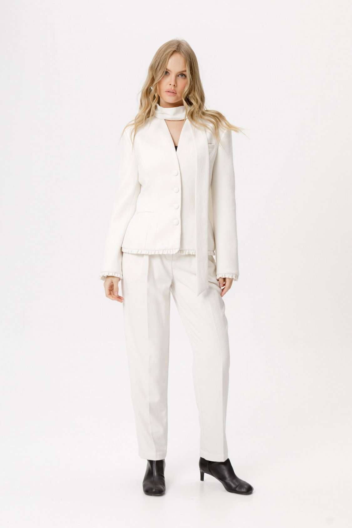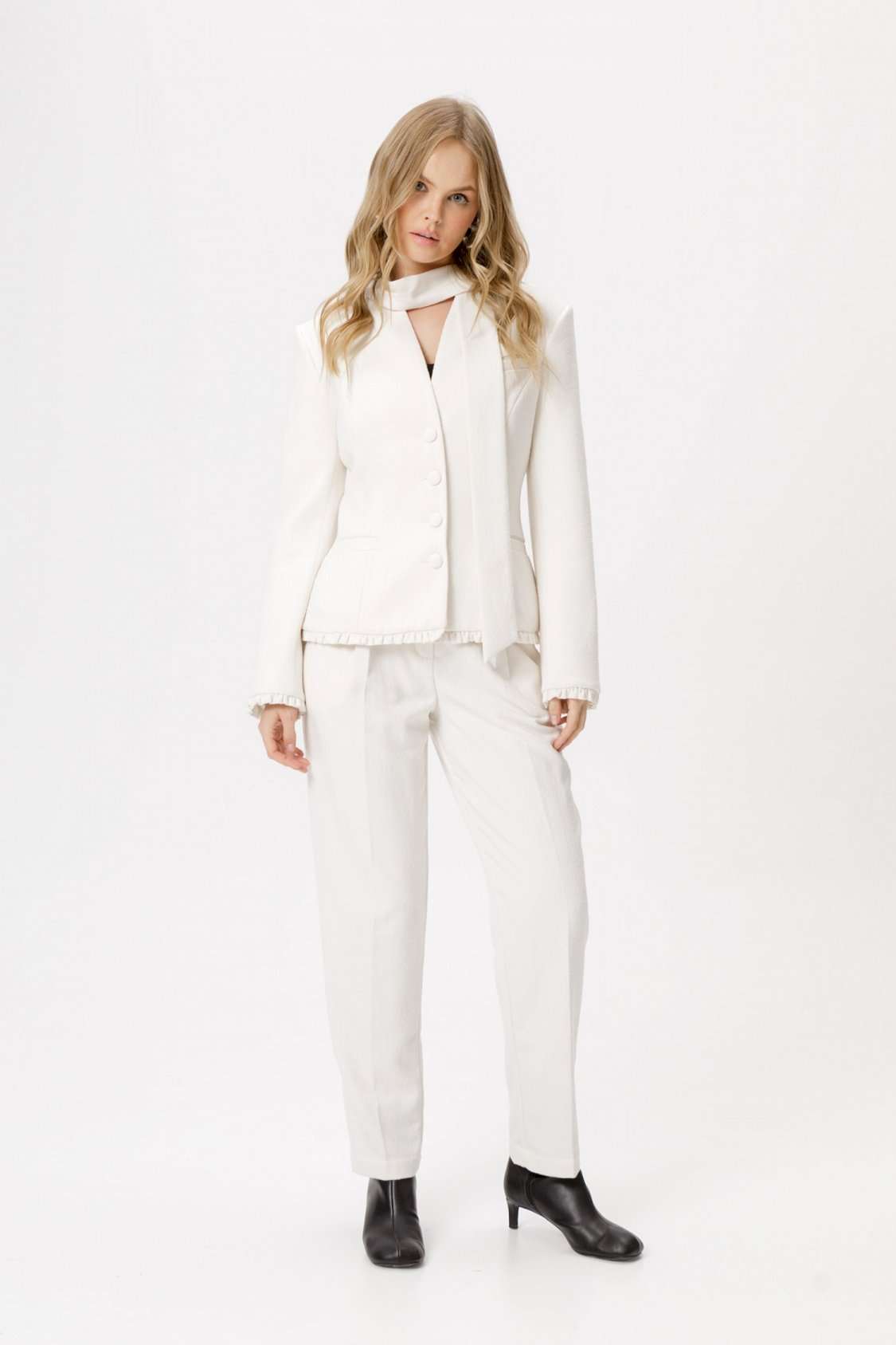 Приталенный жакета со съемным шарфиком из фактурной ткани «букле». Детали: жакет полуприлегающего силуэта, цельнокроеный воротник-стойка, рельефные швы переда и спинки, функциональные карманы, застежка на петли и пуговицы, на подкладке. В комплекте съемный шарфик. Длина по спинке около 56 см в размерах 40-46 и около 58,5 см в размерах 48-52, длина рукава с оборкой около 61 см.