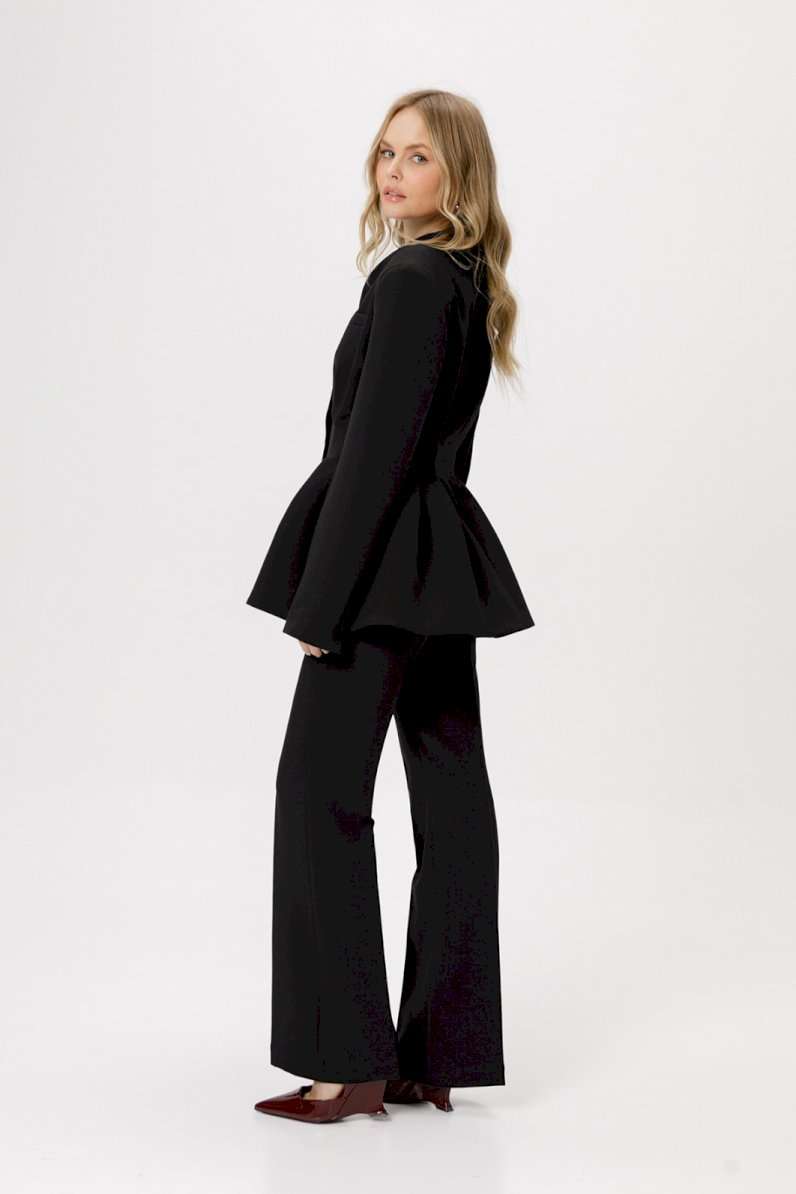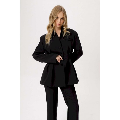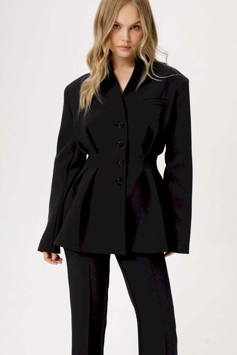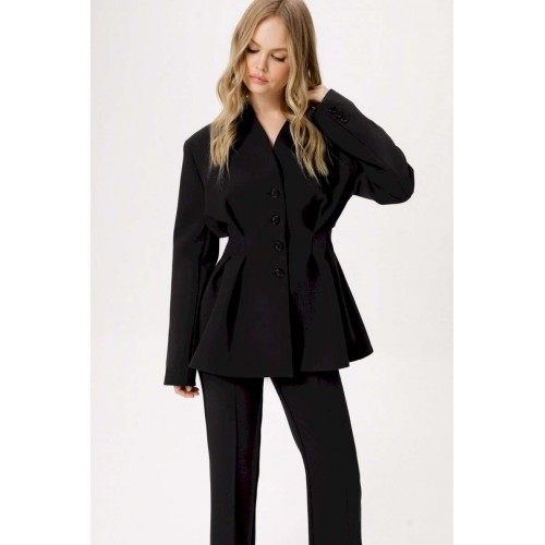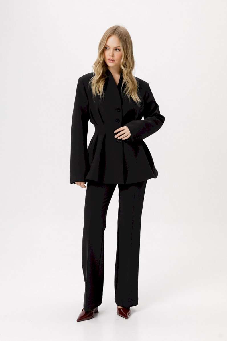 Приталенный жакет со складками и расширенными плечами. Детали: полуприлегающий силуэт с расширенными плечами, цельнокроеный воротник-стойка, застежка на петли и пуговицы, рукава втачные двушхшовные, жакет на подкладке Длина по спинке около 66 см в размерах 40-46 и около 67,5 см в размерах 48-52, длина рукава около 61 см