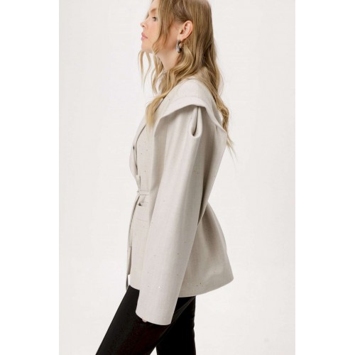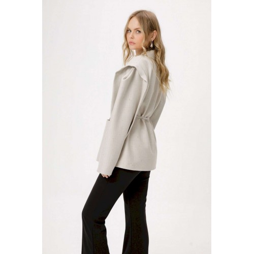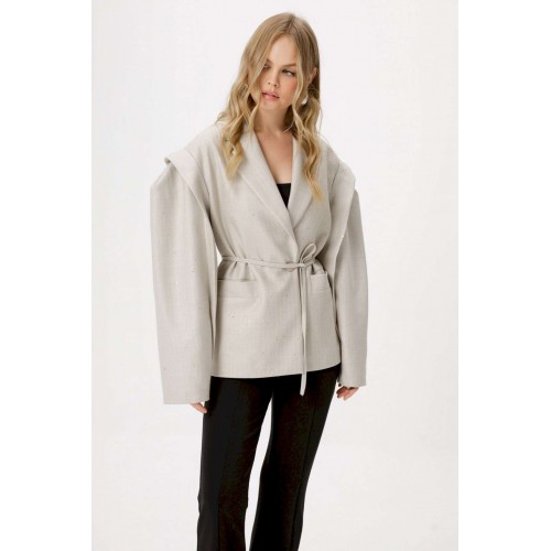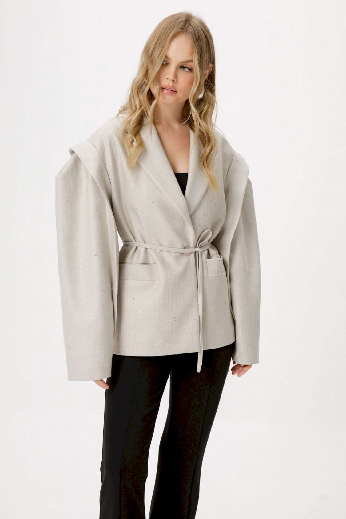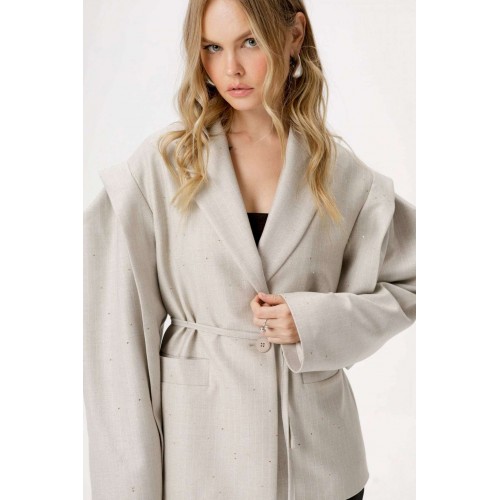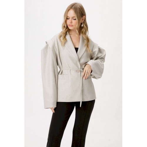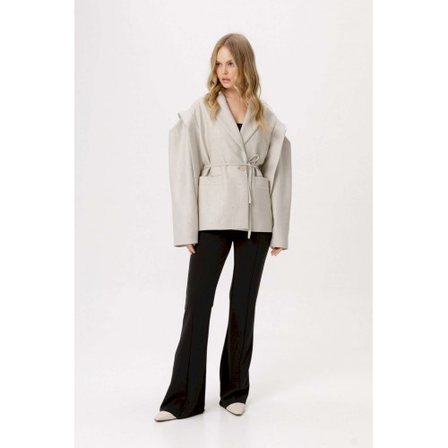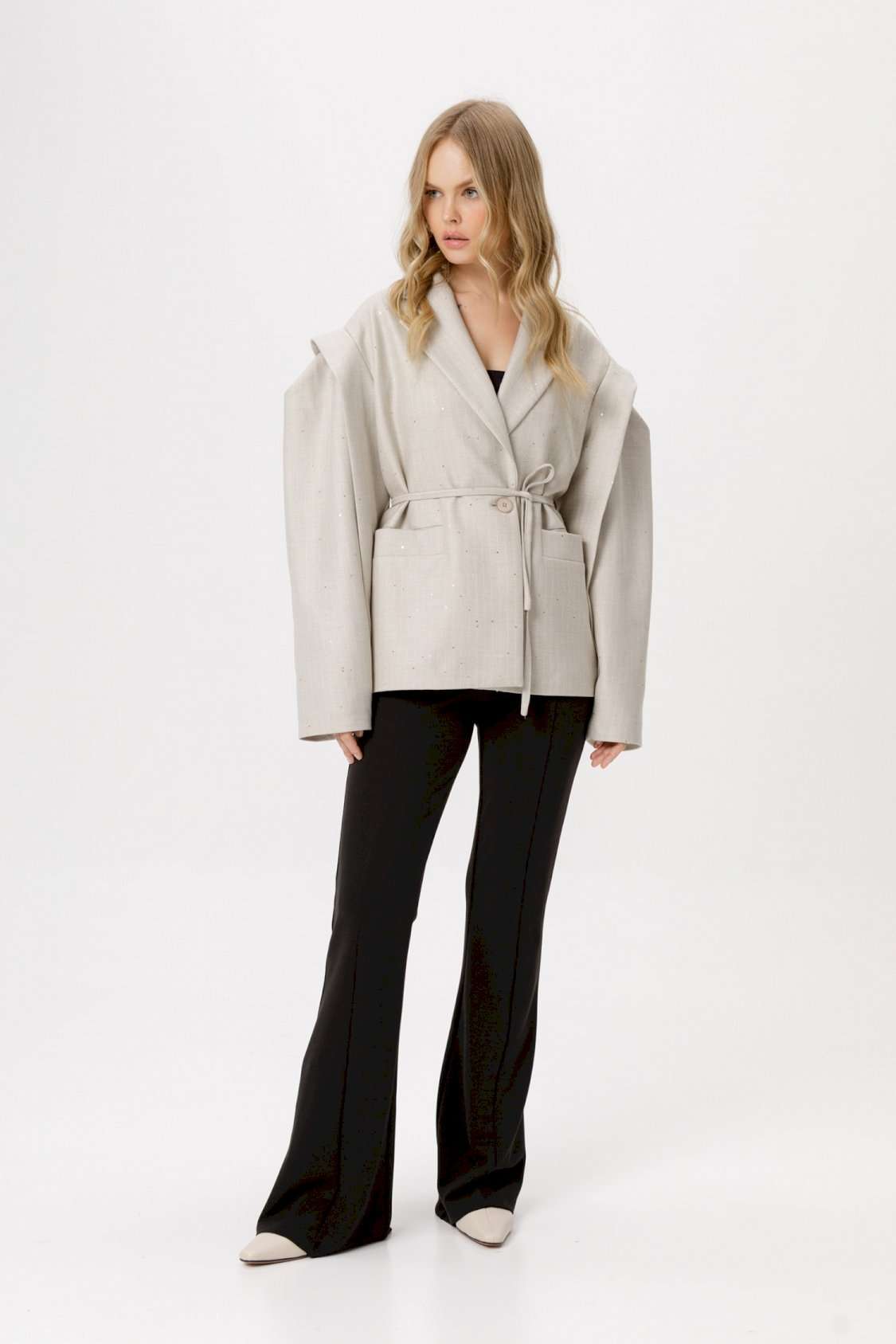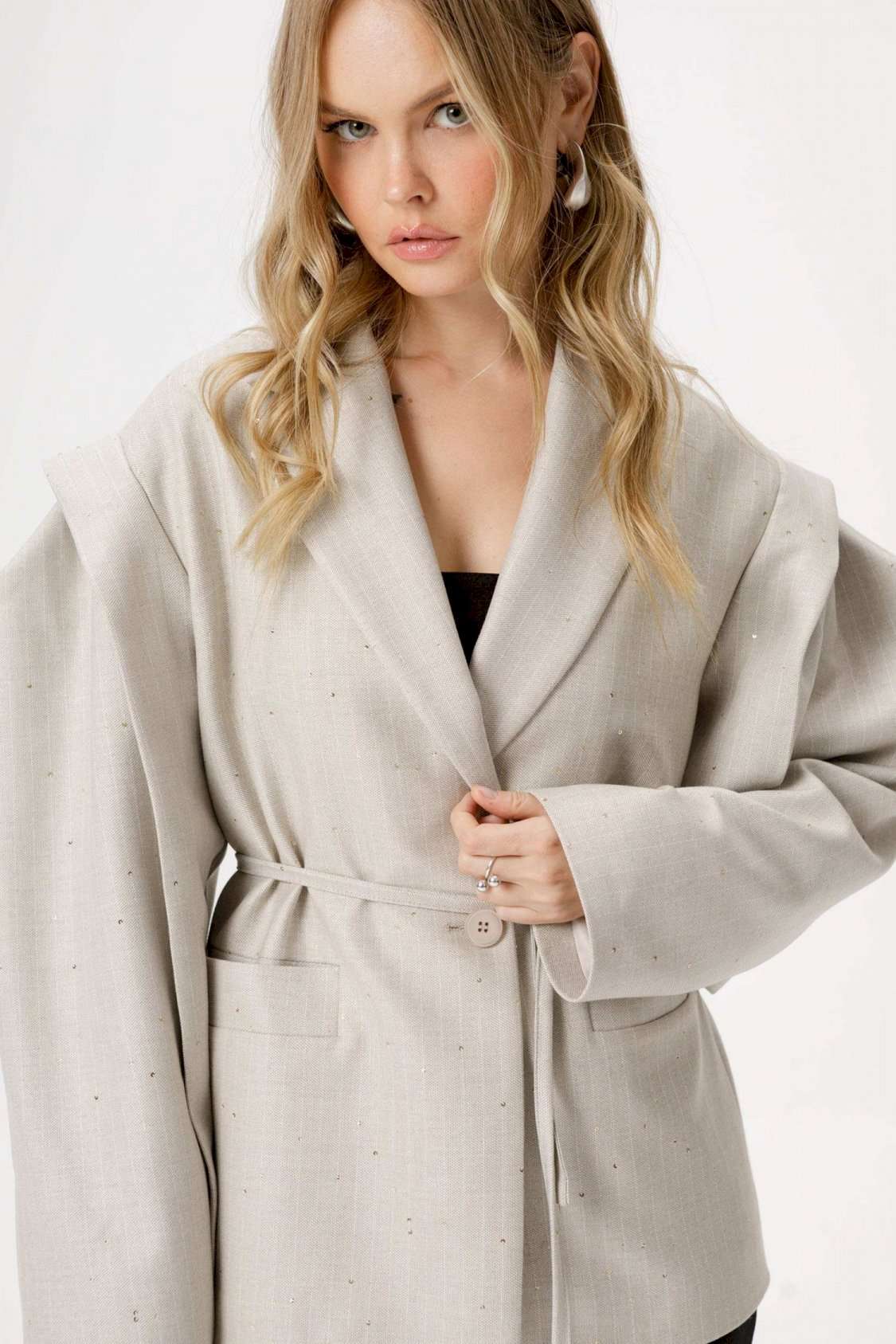Оверсайз жакет со съёмным поясом. Детали: прямой силуэт, удлинённая линия плеча, втачной одношовный рукав с ассиметричными складками, функциональные карманы, центральная застёжка на 1 пуговицу, жакет на подкладке. Длина по спинке в размерах 40-46 около 67 см, в размерах 48-52 около 70 см, длина рукава около 61 см
