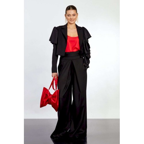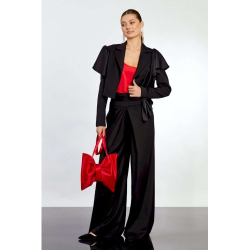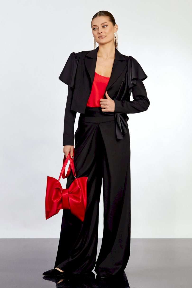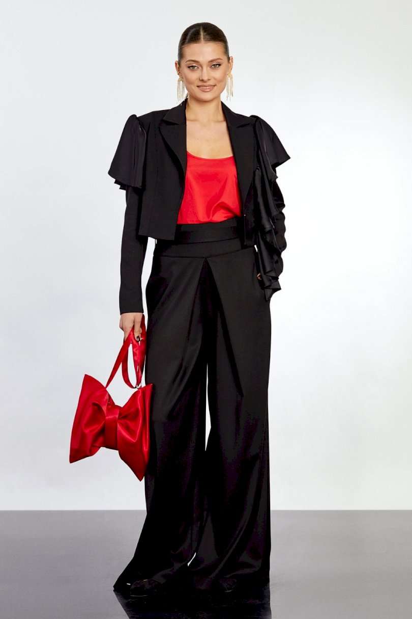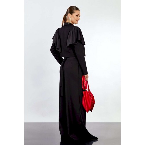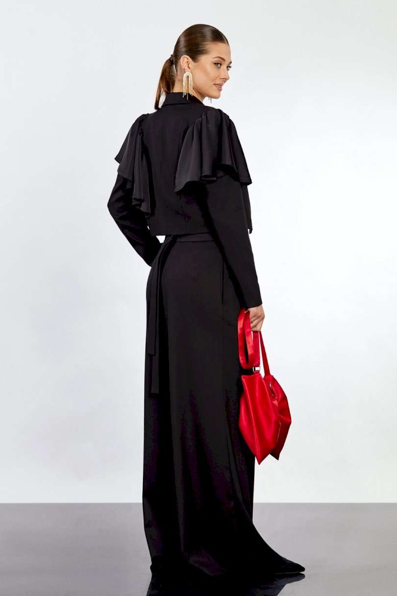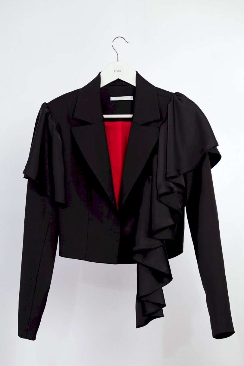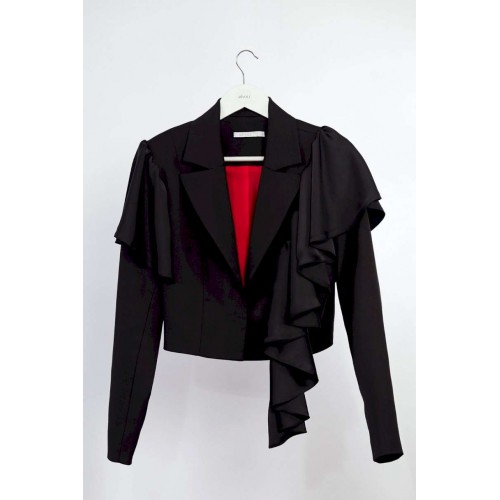 Жакет: - прилегающий силуэт - пиджачный воротник - рельефы сзади и спереди - застёжка на пришивную кнопку - втачные двухшовные рукава - воланы из шелка Армани со сборкой в рельефе левого и пройме правого рукавов