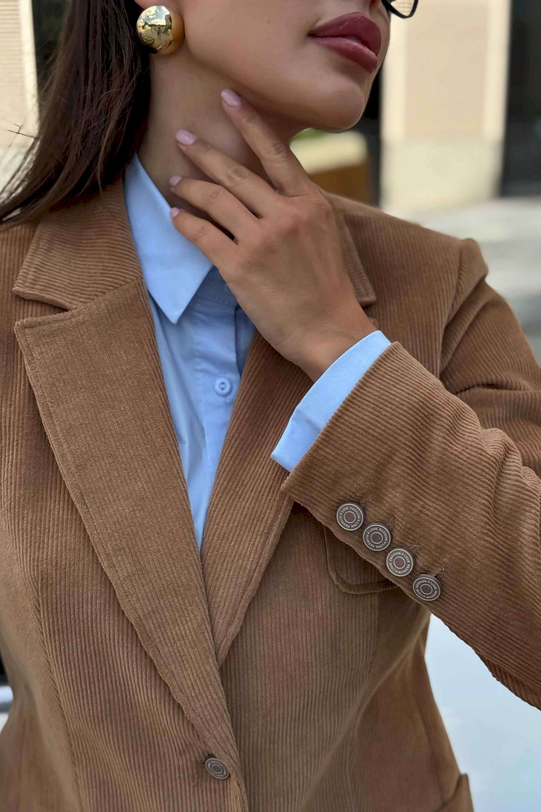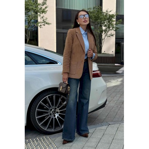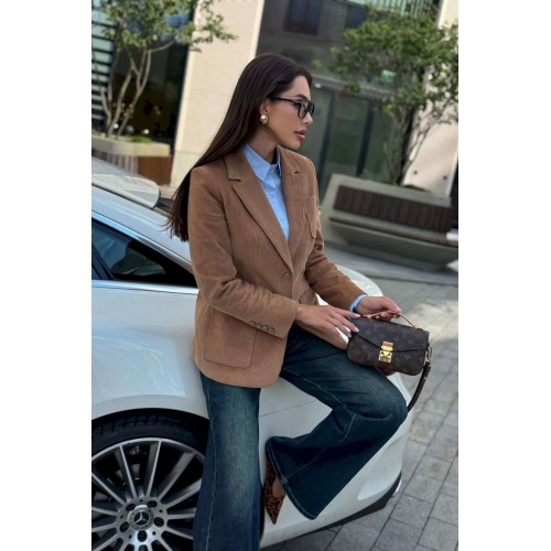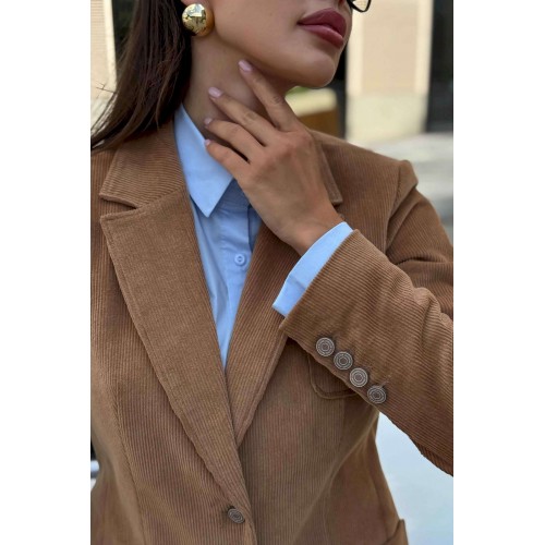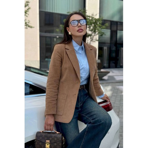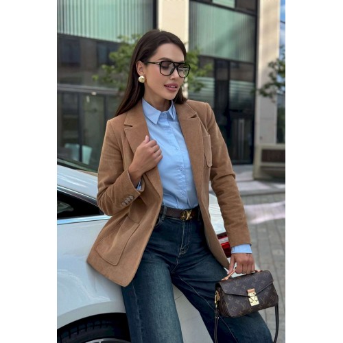 Жакет женский вельветовый коричневый URS — это сочетание элегантного стиля и практичности. Классический приталенный крой, лацканы и застёжка на пуговицы делают его универсальным вариантом для офиса, прогулок и городских встреч. Жакет женский полуприлегающего силуэта, выполнен из костюмной вельветовой ткани, на подкладке, с воротником пиджачного типа, предназначен для повседневной носки. Перед жакета с центральной бортовой застежкой на 2 петли и 2 пуговицы (фурнитура может незначительно отличаться от фото), с закругленными по низу бортами. Перед с полурельефами и с вертикальными рельефными швами. Нижние части переда и верхняя левая часть переда с накладными карманами закругленной формы. Спинка с рельефными швами, со средним швом в нижней части со шлицей. Рукава втачные двухшовные длинные, локтевые швы со шлицей, застегивающиеся на 4 петли и 4 пуговицы (фурнитура может незначительно отличаться от фото). По краю борта, лацканам, воротнику, карманам прострочена отделочная строчка шириной 0,5см. Жакет с плечевыми накладками. Тип ткани костюмная.