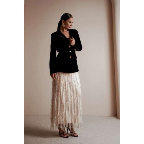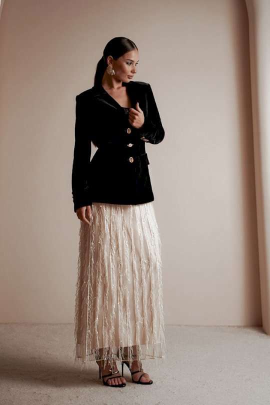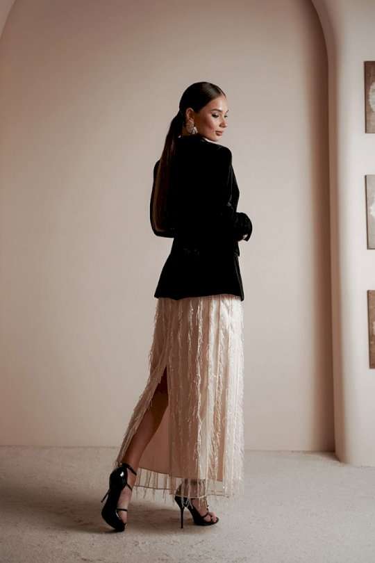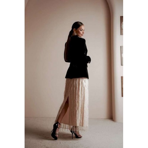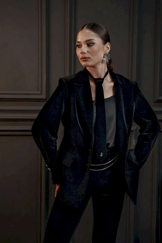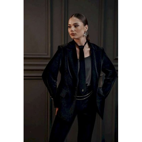 Жакет из полотна «бархат», полуприлегающего силуэта, с центральной застежкой на три петли и декоративные пуговицы. Перед с нагрудной вытачкой, отрезным бочком, с настрочным клапаном. Спинка с отрезным бочком, средний шов заканчивается открытой шлицей. Шлица длинного рукава украшена декоративными пуговицами. Воротник пиджачный. Длина рукава 63 см. 44 р-р: ОГ - 98 см., ОТ - 84 см., ОБ - 110 см. 46 р-р: ОГ - 102 см., ОТ - 88 см., ОБ - 114 см. 48 р-р: ОГ - 106 см., ОТ - 92 см., ОБ - 118 см. 50 р-р: ОГ - 110 см., ОТ - 96 см., ОБ - 122 см. 52 р-р: ОГ - 114 см., ОТ - 100 см., ОБ - 126 см.